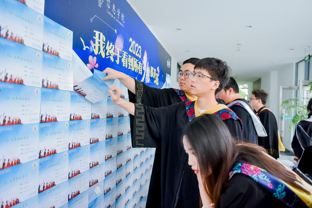 会场外布置了一面签名墙,一封封书信贴满了整面墙。入场前,毕业生们惊喜地发现,这一封封信正是他们这届学生在四年前初入华农时每个人写给四年后自己的一封信。1391天前,在同一地点举行的明星换脸av 2019级新生开学典礼上,明星换脸av 通过一场“梦想投递仪式”将这届学生最初的梦想封存保管,许诺将在他们毕业时启封。四年之后,明星换脸av 以一场主题为“我终于看到所有梦想都开花”的特别企划履行四年之约,让每名毕业生从签名墙上揭下自己的那封信,并在花形便利贴上签名留言,贴在取信后空出的位置,用这个过程诠释“梦想开花”的主题。场内大家开启信件,与四年前的自己对话。大数据1901班岑行结合她四年前的这封信分享了自己的毕业心声:“毕业并不是终点,而是新征程的起点。我们将带着明星换脸av 给予我们的财富继续前进!”