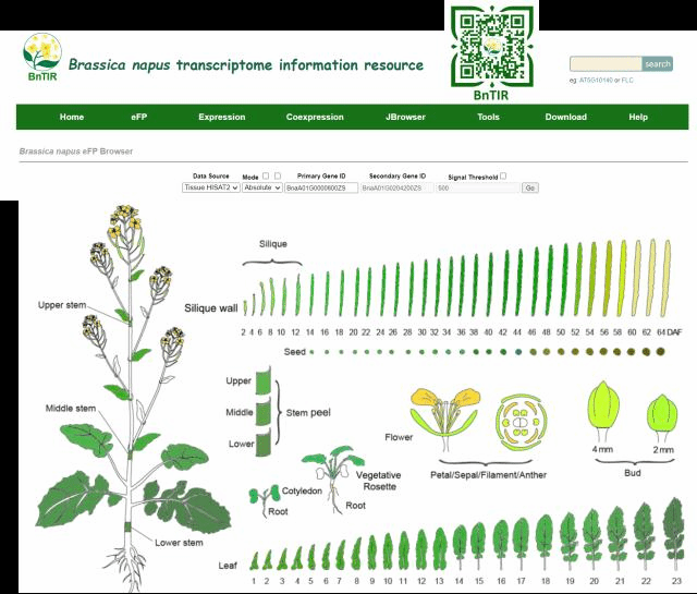 在该研究中,研究者基于高质量的转录组,建立了BnTIR数据库,该数据库集合了基因表达信息查询、eFP可视化、基因共表达网络、基因组浏览器等功能模块,并提供了基因ID转换、序列比对、序列提取、转录因子家族以及热图绘制等工具,为研究者提供了一个方便快捷、功能全面的信息获取平台。另外,数据中还包括了油菜发育中种子26个时间点的基因表达谱,这对于油菜种子发育过程相关研究具有重要意义。