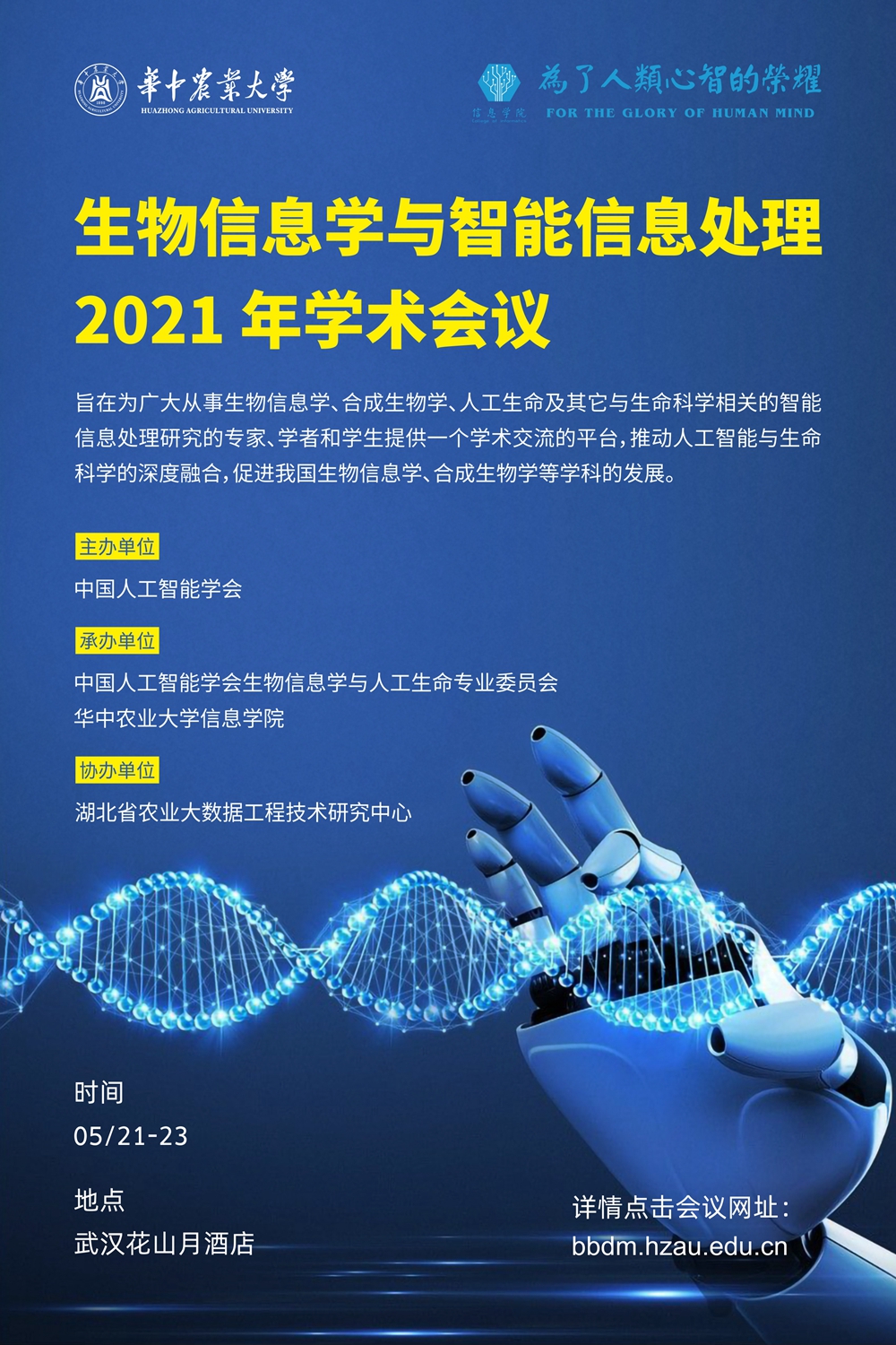 会议主题:人工智能+健康,旨在为广大从事生物信息学、合成生物学、人工生命及其它与生命科学相关的智能信息处理研究的专家、学者和学生提供一个学术交流的平台,推动人工智能与生命科学的深度融合,促进我国生物信息学、合成生物学等学科的发展。