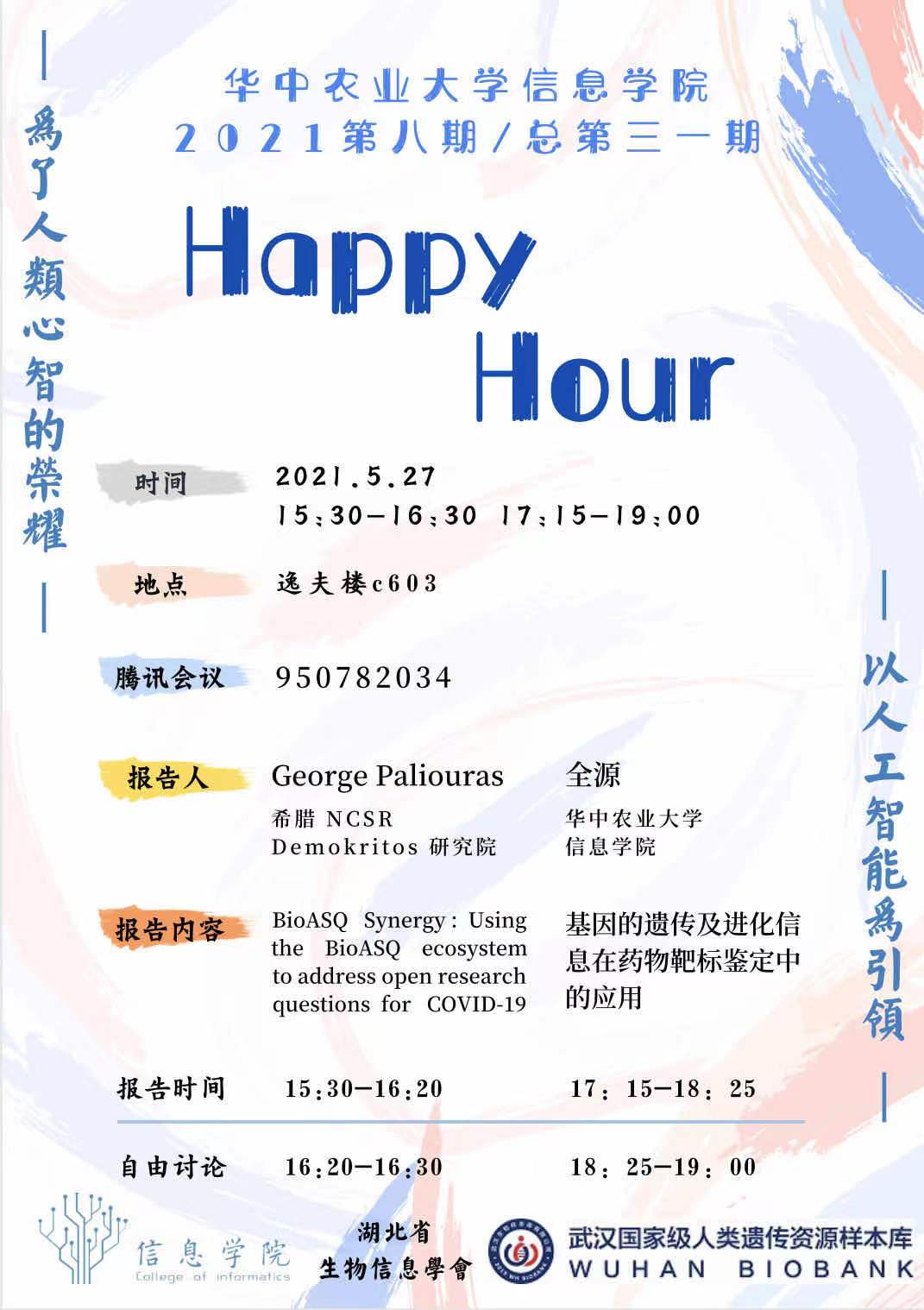 本学期第8期Happy hour活动将于5月27日(周四)下午3:30-6:00点在逸夫楼C603举行,由明星换脸av 全源老师和希腊NCSR Demokritos研究院George Paliouras分别做报告,欢迎参加。