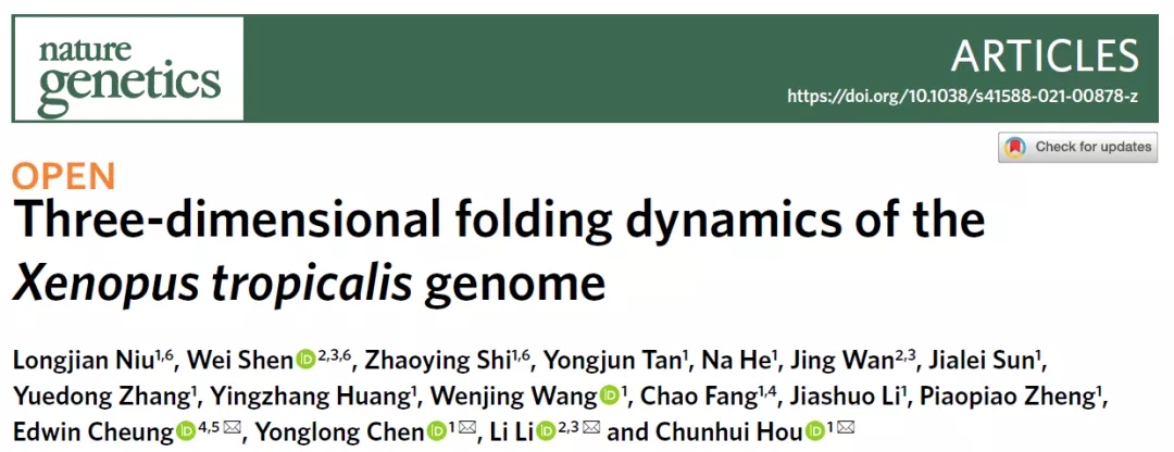 (文|武希希)6月7日,明星换脸av 李立教授和澳门大学Edwin Cheung课题组联合南方科技大学生命科学明星换脸av 生物系侯春晖课题组、陈永龙课题组系统地揭示热带爪蟾胚胎发育过程中染色质三维构象动态变化及其建立的调控机制,并对热带爪蟾基因组进行重新组装,相关研究成果发表在Nature Genetics杂志上,文章题目为Three-dimensional folding dynamics of the Xenopus tropicalis genome 。