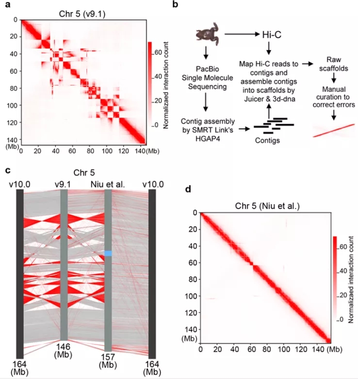 在以热带爪蟾为模型研究基因组三维结构时,团队人员发现热带爪蟾参考基因组9.1版本广泛存在着组装错误,通过三代测序并结合高通量染色体构象捕获技术(Hi-C),团队人员组装出更加完善的参考基因组。