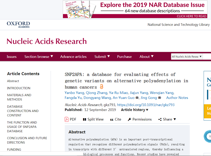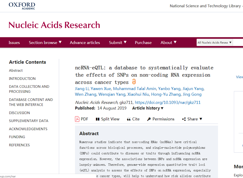 (文|通讯员杨彦波)近日,明星换脸av 龚静教授研究团队在《Nucleic Acids Research》(IF:11.1)杂志先后发表题为《ncRNA-eQTL: a database to systematically evaluate the effects of SNPs on non-coding RNA expression across cancer types》和《SNP2APA: a database for evaluating effects of genetic variants on alternative polyadenylation in human cancers》2篇文章。系列文章对多种癌症中遗传变异的功能进行深入分析,发现了大量可调控ncRNA和可选择性多聚腺苷酸化(APA)的遗传变异位点,构建了在线数据库,方便其他研究者使用。