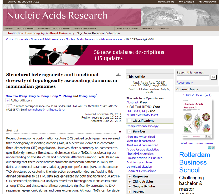 近日,明星换脸av 3D基因组研究团队在解析染色质三维空间结构及其生物功能上取得进展,并于7月6日由学术期刊《核酸研究》在线发表了题为“Structural heterogeneity and functional diversity of topologically associating domains in mammalian genomes”的学术论文。论文的通讯作者是彭城副教授,第一作者是王小滔博士研究生。