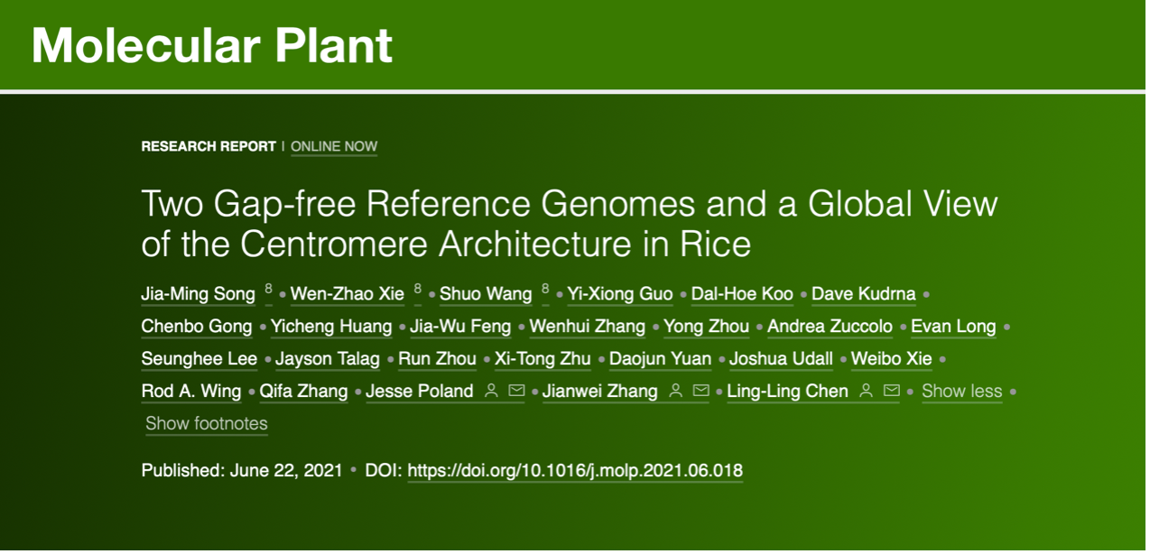 (文|谢文召 王朔 审核人|张红雨)6月22日,明星换脸av 作物遗传改良国家重点实验室水稻研究团队联合广西大学、美国堪萨斯州立大学等多所高校合作完成籼稻珍汕97和明恢63的无缺口(gap-free)参考基因组,系统分析了着丝粒结构和位于11号染色体末端水稻抗性相关的结构变异区域。相关研究以“Two Gap-free Reference Genomes and a Global View of the Centromere Architecture in Rice”为题发表于Molecular Plant。