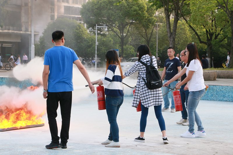 在杨老师为大家详细讲解了各种火灾预防工具的使用,以及灾难面前正确的自护和逃生技巧后,全体师生前往狮子山广场喷泉处进行消防安全演练。在工作人员的安排下模拟火场,三人一组挨个使用灭火器进行“灭火”实战。大部分人都是第一次实际使用灭火器,大家都很珍惜“实战”机会,当面临真正的“火”时,仍有因内心紧张或使用不熟的同学连灭火器的消防栓都没能成功拔下来;也出现了看似灭完了大火,一扭身星星之火又重新燃起的情况。整个过程虽是模拟,但仍然给大家或多或少身临其境的紧张感。