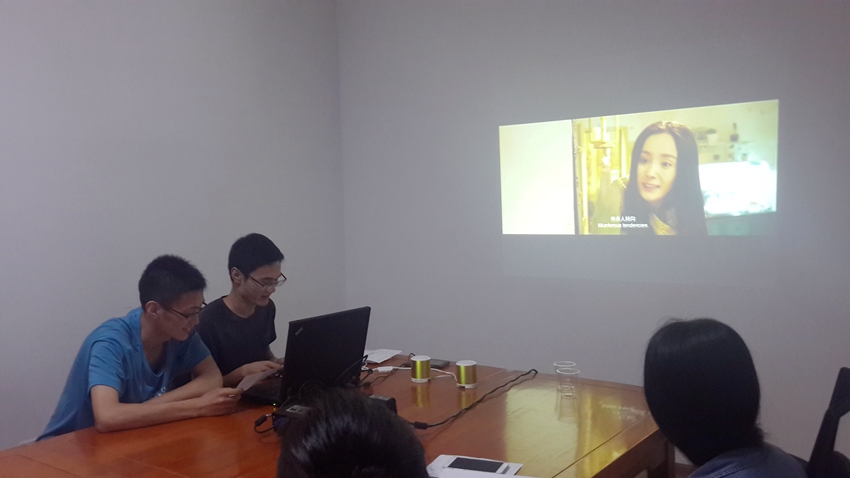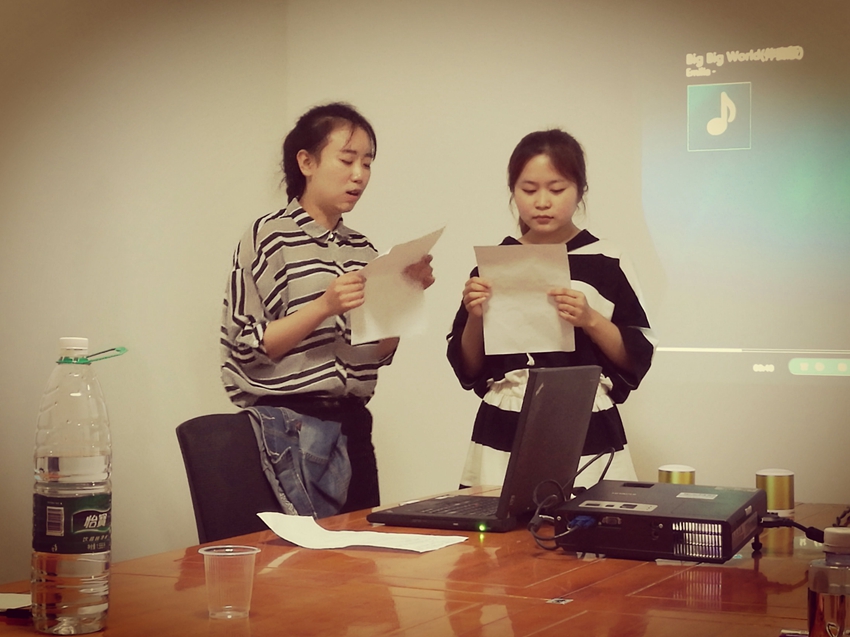 不到两点半,会议室已经熙熙攘攘,参赛者开始排队拷贝节目材料,观看者尝试占据较好席位。活动主持人陶婧芬介绍,本次活动主要以英文电影配音和英文歌曲演唱为主,鼓励大家或单人或团队参赛,不过大家普遍倾向于组队报名。