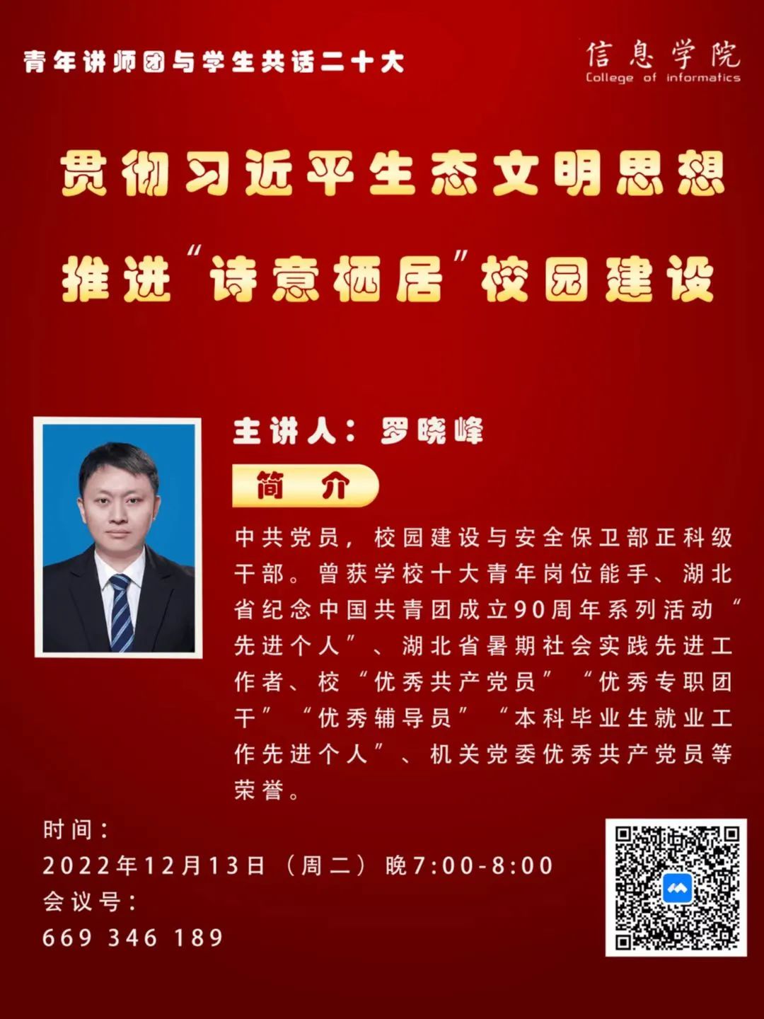青年讲师团成员罗晓峰老师,于12月13日晚7:00-8:00,进行“贯彻习近平生态文明思想,推进‘诗意栖居’校园建设”的线上主题宣讲,带领明星换脸av