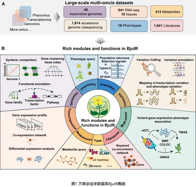 、湖南农业大学以及湖南省农科院作物研究所等多单位在Plant Communications 发表论文BjuIR: a multi-omics database with various tools for accelerating functional genomics research in Brassica juncea。该研究通过搜集和整合芥菜基因组、转录组、变异组、表型组和代谢组等5个组学的数据,构建了首个芥菜多组学数据库BjuIR,为芥菜功能基因组学研究和遗传育种提供了宝贵的数据资源和分析平台。