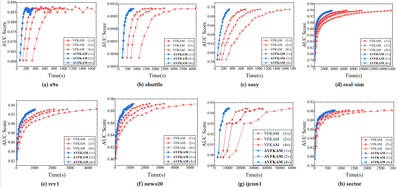 纵向联邦学习(Vertical Federated Learning, VFL)因其隐私保护和多方协作建模的优势在人工智能领域引起广泛关注。现有VFL算法主要关注模型的平均预测精度,然而在面对不平衡数据时,基于平均精度的模型很难正确地对少数样本进行分类。AUC (Area Under the Curve) 是评估模型在不平衡数据上性能的有效指标。因此,以AUC为模型优化目标可增强其处理不平衡数据的能力。此外,VFL系统中的计算资源通常是不平衡的,这使得同步VFL算法难以匹配现实应用场景。为解决上述2个不平衡问题,明星换脸av 人工智能与统计学习团队提出基于核方法的异步纵向联邦AUC最大化算法AVFKAM,从理论上证明了AVFKAM的收敛性和安全性,而在应用上,基准数据集上的实验结果则表明了AVFKAM保持较高AUC性能和效率。