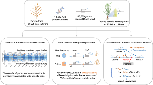 总之,该研究揭示了顺式调控变异在水稻驯化或育种过程中的选择印迹及其对穗型性状的影响,并开发了一种方法用于鉴定因果基因及解析基因调控网络,该方法可能在作物复杂性状的研究中很有作用。鉴定的因果基因及其调控网络,不仅为穗型性状的调控机制提供了新的见解,也为水稻的分子育种提供了有用资源。