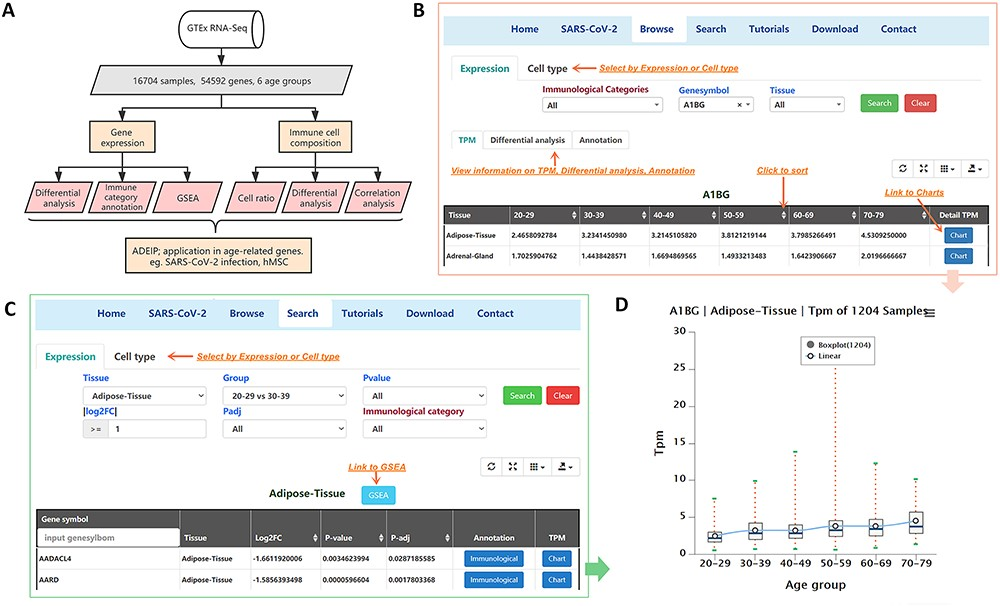 ADEIP包括来自GTEx计划中30个主要人体组织超过16000个样本的基因表达数据,这些样本来的年龄范围在20-80岁之间的捐赠者。该研究对不同年龄组的差异表达基因和基因集、免疫相关基因和免疫细胞组成等几个方面进行了整合分析。同时对已知与SARS-CoV-2和人类间充质干细胞(hMSC)相关的基因进行了举例分析,展示了ADEIP的相关应用。作为一个比较全面的平台,ADEIP可用于研究与衰老相关的表达和跨组织的免疫地图,有助于了解与年龄相关的传染病或遗传疾病的机制,从而开发个性化的治疗方案。