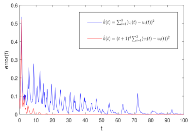 此前研究结果中,自适应算法只能获得渐近收敛的结果,无法获得对误差的收敛性的估计。在无界时滞神经网络的稳定性分析中,有一个重要结论,即随着时滞的变化,误差的收敛速率会由指数向幂数甚至对数收敛转变。鉴于此,该研究提出了一种新的自适应算法,该算法依赖于一类特殊函数,从理论上证明了同步误差可以被该特殊函数所界定,从而获得对误差函数的估计并确保了其渐近收敛性。数值实验的结果表明,该特殊函数的引入能够加速网络同步收敛,但同时也可破坏原有增益的收敛性,而这一点在有界时滞情形是不会发生的。