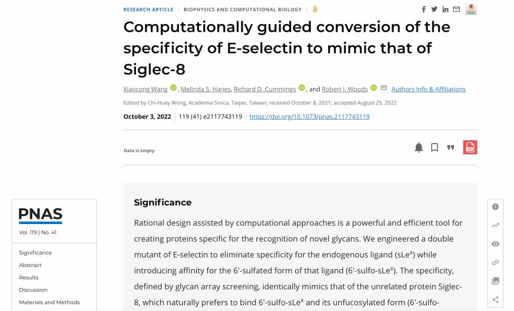 生物信息系青年教师王晓聪博士为该论文第一作者,美国佐治亚大学复杂碳水化合物研究中心Robert Woods教授为通讯作者,哈佛大学Melinda Hanes博士与Richard Cummings教授完成实验工作。