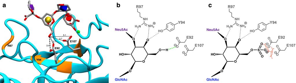 研究团队以白细胞表面的E选择蛋白为目标,对其进行分子模型的建模和分子动力学模拟,揭示E选择蛋白与唾液酸路易斯-X糖(sialyl Lewis X, sLex)结合,但其6’-硫酸化衍生物(6’-sulfo-sLex)中的硫酸根与结合区域内的两个谷氨酸(E92和E107)相互排斥,导致E选择蛋白不与该6’-硫酸化衍生物结合。研究团队在E选择素的分子模型中对谷氨酸进行突变,消除其与硫酸根的相互排斥。研究发现,突变其中单个谷氨酸(E92A或者E107A)都不足以消除相互排斥;但是,双突变(E92A/E107A)不仅可完全消除原有的排斥相互作用,同时可引进新的与6’-硫酸根的相互作用,增进E选择蛋白与6’-sulfo-sLex的相互作用。哈佛大学Cummings教授课题组通过多糖微阵列技术(Glycan Microarray)证实了理论模型的预测,并发现突变改造后的E选择素产生了只针对6’-sulfo-sLex的结合特异性。研究团队通过进一步研究,提出蛋白工程中引入对特定配体的结合特异性,不仅需要消除对目标配体的排斥与增强对目标配体的结合,同时需要降低对蛋白原生配体的结合。