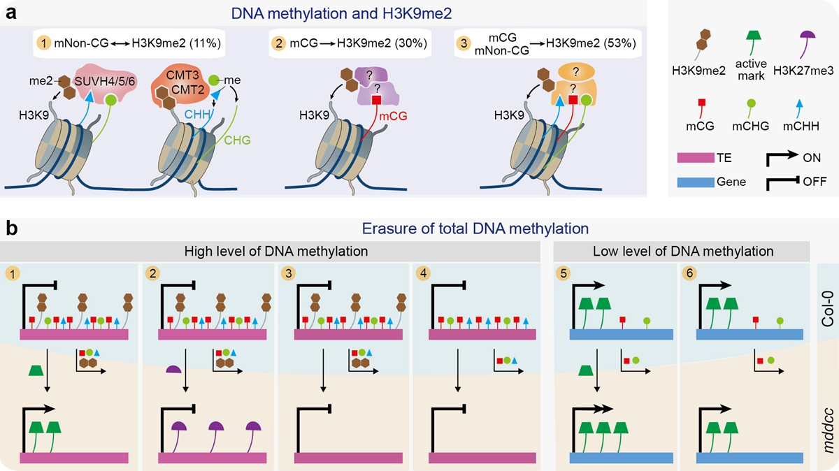该研究综合利用三种DNA甲基化缺失突变体(mddcc:无DNA甲基化;met1:无CG甲基化;ddcc:无non-CG甲基化)和eChIP-seq技术,结合李国亮团队开发的DNA甲基化分析方法,深入解析了DNA甲基化与不同类型组蛋白修饰间的协作关系及其在基因组转录调控中的作用。