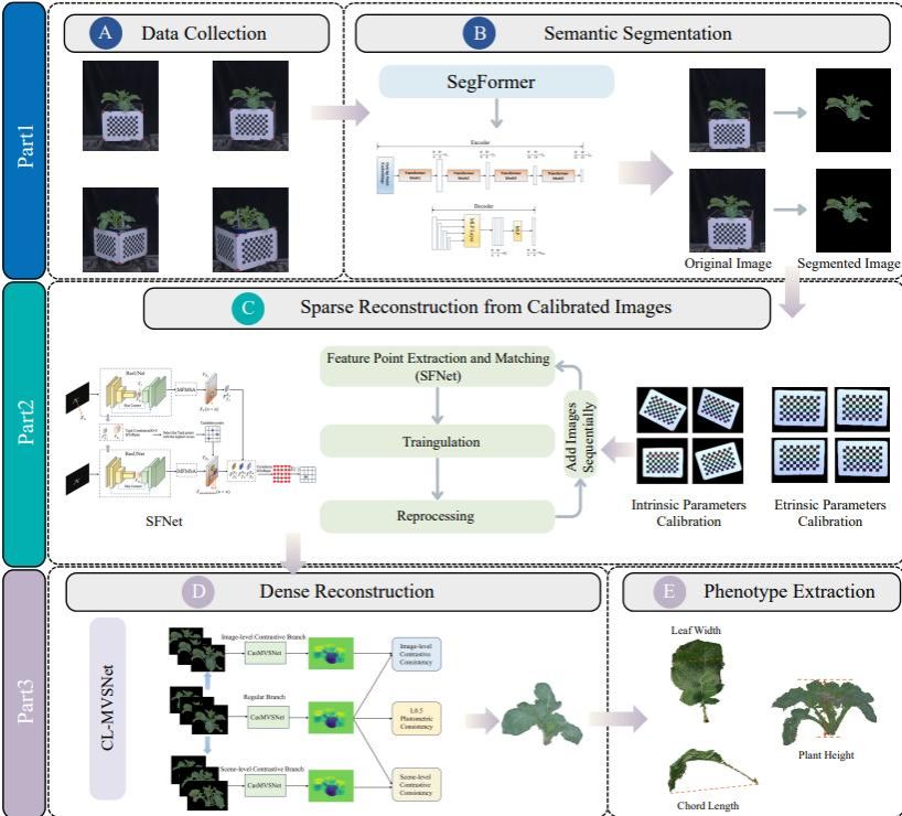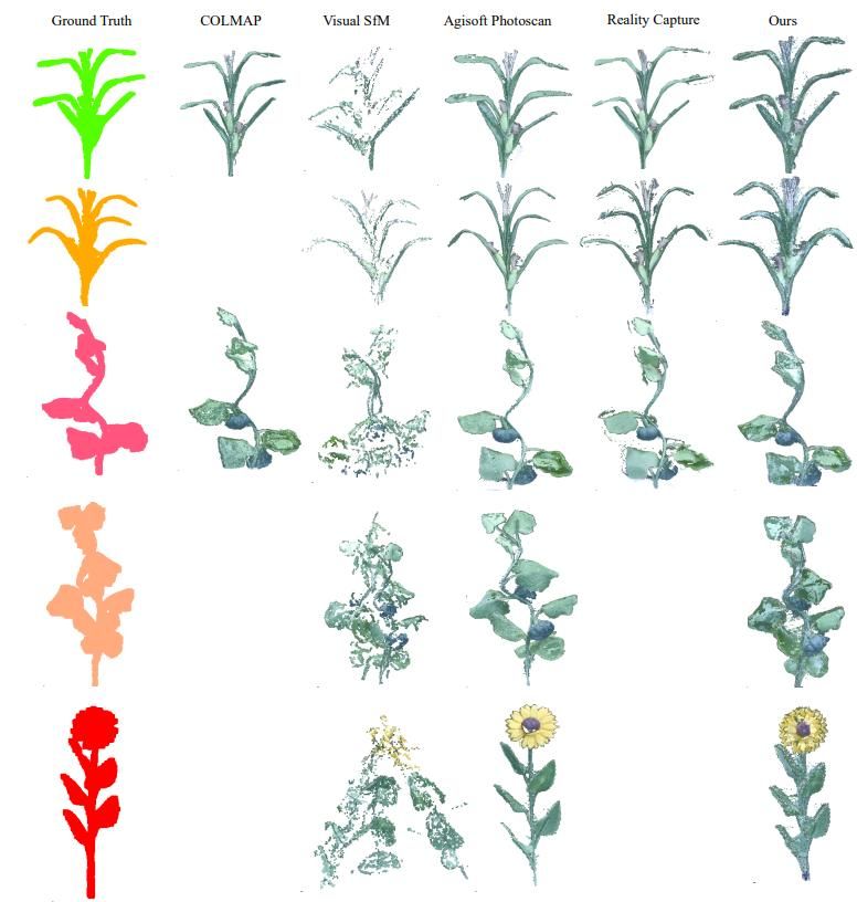 针对这一瓶颈,翟瑞芳研究团队设计了一套从数据采集到结果分析的全自动化“流水线”。该方法核心创新首先在于,提出名为“基于标定约束的稀疏重建(SRCI)”的新算法。它通过事先精确测量相机的镜头参数,为重建过程提供“导航图”,减少了对图像自身特征匹配的过度依赖,从根本上提高了建模成功率。其次的创新之处是,为更好区分看起来相似的植物部位,设计了名为SFNet的特征描述符网络。该网络能同时捕捉叶片的细微纹理和整体轮廓,如同人眼既看细节又观全局,使得计算机在匹配不同照片中的同一片叶子时所提供描述符的表达性能更为优异。