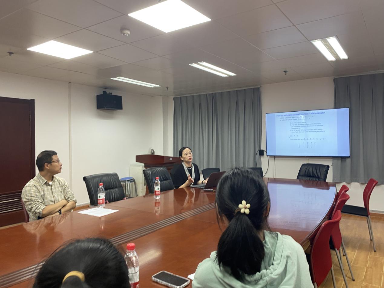 牛晓辉副教授邀请,在一综B316会议室,刘妍岩老师作了题为“Functional Martingale Residual Process for High-Dimensional Cox Regression with Model Averaging”的学术报告,毛光才老师作了题为“Statistical Inference for Heterogeneous Treatment Effect with Right-censored Data from Synthesizing Randomized Clinical Trials and Real-world Data”的学术报告。