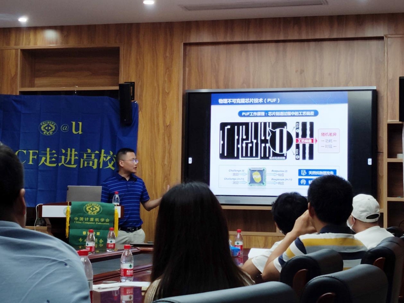 对CCF容错专委3位学者及师生的到来表示热烈欢迎,并对3位学者作了简要介绍。张吉良教授介绍了专委的历史、近期专委承办的学术活动和年会等,然后他以“集成电路硬件安全”为题,从中国对集成电路的需求、芯片自给率不足以及中兴华为事件出发,介绍了当前集成电路面临的硬件木马、侧信道、逆向工程等严重安全威胁。接着介绍了新型集成电路硬件安全关键技术,物理不可克隆芯片(PUF)设计及应用、集成电路芯核(IP)保护技术以及硬件辅助安全等前沿研究方向,并介绍了课题组在物理不可克隆安全芯片研究、IP核保护等领域取得的系列研究成果。