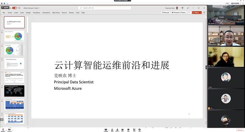 此次会议邀请到了微软云服务部数据科学家党映农博士作为会议的主讲嘉宾。会议伊始,李国亮教授对主讲嘉宾作简要介绍,并欢迎党映农博士参与本次会议报告。党博士以“智能运维(AIOps)的概念和作用”为开篇,结合自己在微软的工作经历,详细介绍了智能运维在云计算平台中发挥的作用和重要意义。云计算(cloud computing)是分布式计算的一种,是通过网络“云”将巨大的数据计算处理程序和资源分布在不同空间,完成单一物理资源不容易完成的计算任务。像微软这样的云计算头部企业,在云计算的运行维护中,需要满足多方面的需求,比如系统快速开发、系统自我诊断、自我修复、客户需求的预判等。如何管理、维护上百万、上千万台的云计算平台设备并满足各方需求,是云计算运维中的重大挑战。针对当前工业界的现状及需求,党博士从目前的云计算运维发展模式和面对的挑战开始,逐步过渡到“智能运维”,详细解释了为什么要使用云计算智能运维,以及当前智能运维的发展趋势,内容由浅入深,叙述结构层次分明,使与会者真正地了解了当前智能运维的前沿技术和发展现状。