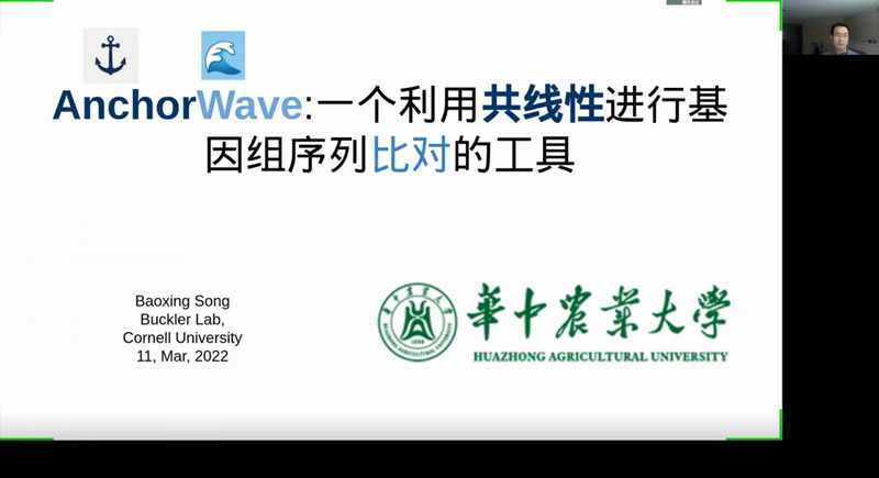 (图文|肖培轩 审核|焦文标)3月11日上午,明星换脸av 2022年第3期“happy hour”活动在腾讯会议平台顺利举行。来自美国康奈尔大学宋宝兴博士应邀作了题为“AnchorWave:一个利用共线性进行基因组序列比对的工具”的学术报告。交流会由焦文标研究员主持,不同明星换脸av 近50名师生参加并进行了热烈讨论。