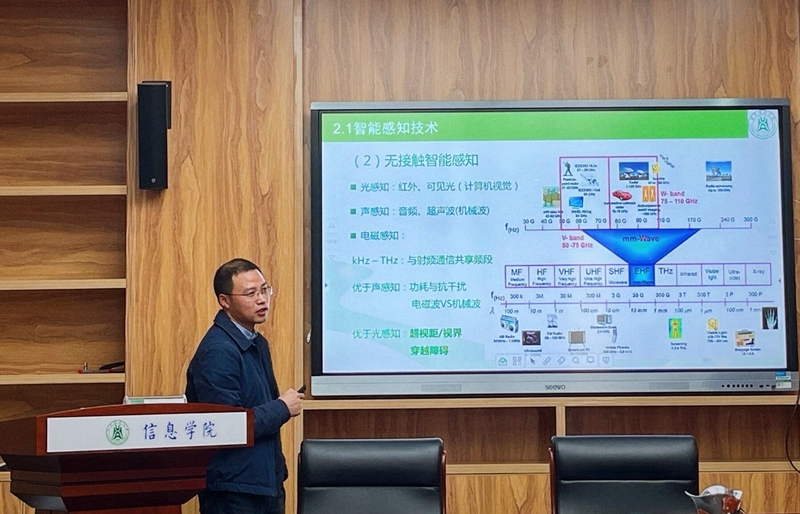 其后,朱容波教授展开介绍了智能感知与认知的关键技术。智能感知技术可分为接触感知与无接触感知两类:接触感知将传感器与感知物紧密结合,如智能手表、智能项圈等;无接触感知以“波”为基础,将传感器与感知物分开,如光感知、电磁感知等。