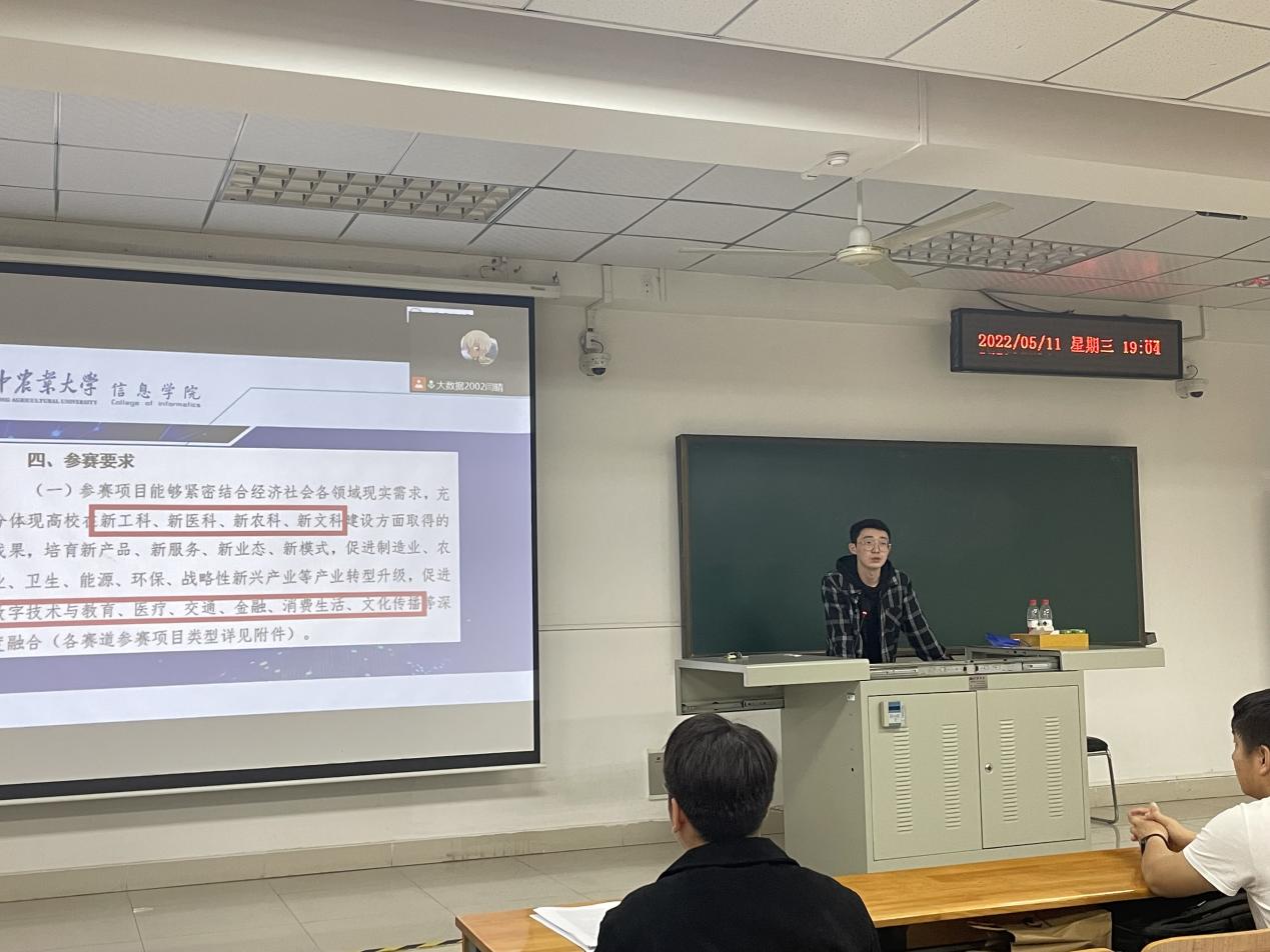 本次宣讲会第一部分,由辅导员高鹏淇再次介绍“互联网+”大赛。他向大家介绍了比赛主题、比赛时间、比赛内容、参赛要求、赛程要求以及参赛奖励等,他鼓励同学们要勇于尝试敢于尝试,要“先下水”才能“学会游泳”,只要是有好的想法都可以大胆尝试,不要待在自己的舒适圈中。