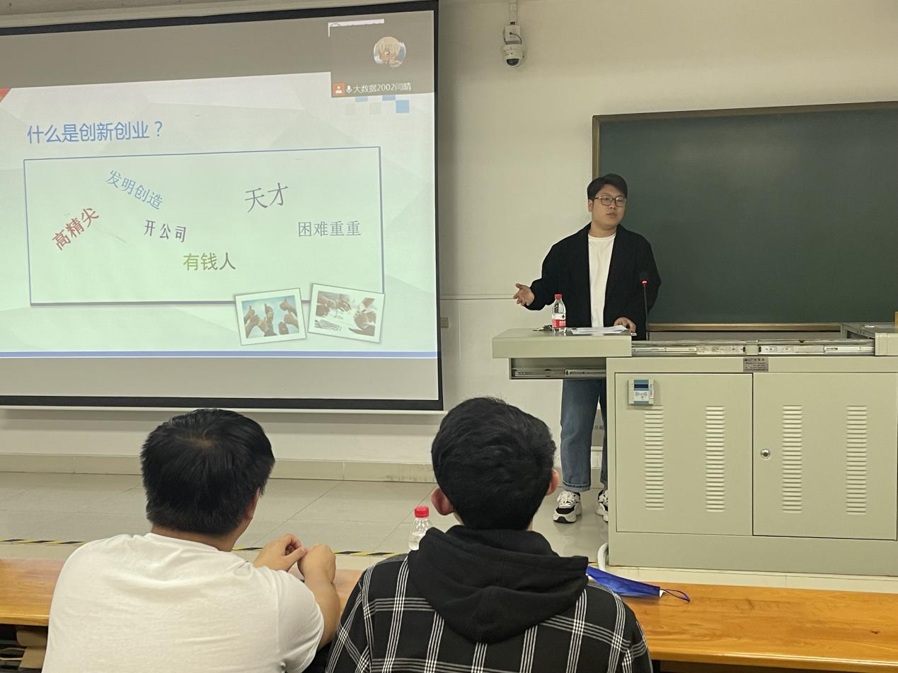 接着,由校团委戚宝磊老师从引入性和科普性出发为我们详细介绍了几种创新创业赛事。在谈到什么是创业创新时,同学们可能会认为创新创业更多的是与“高精尖”、“天才”、“有钱人”、“开公司”、“困难重重”等词语挂钩,但戚老师说到,创新创业并没有想象中的遥不可及,它更贴近生活。围绕这一问题,戚老师向我们讲解了创新创业的七位一体,重点介绍了创新创业基金。在如何迈出第一步的问题上,对于小白来说,要拓展视野、大胆尝试、积累经验,对于有一定基础的人来说,是掌握技术、吃透规则、多学多练。参加创新创业比赛不仅可以提升创新创业的能力、减少试错成本,更有意义的是认识创业导师、收获可靠的团队。同时,也开阔了自己的视野,与不同专业的同学组队,让我们更能了解其他专业的人是怎样看待问题的。参加创新创业赛事可以提升自己的知识水平和实践经验,学生和老师结合,成功即是双赢,就算失败,也是一个育人的过程,这也是一个不容错过的机会。