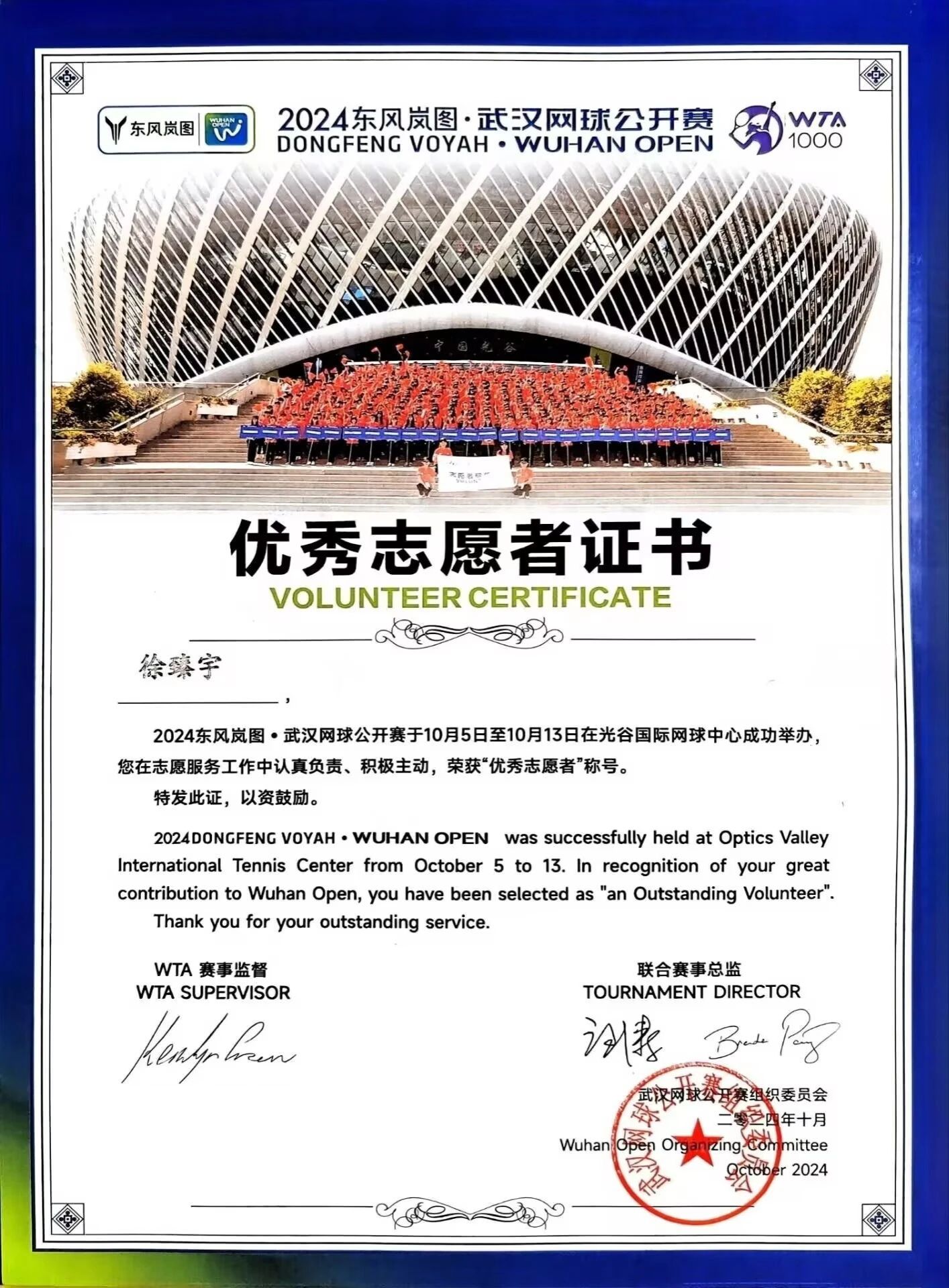 2024年10月5日至10月13日,明星换脸av 生物信息学专业2301班的徐臻宇在武汉光谷国际网球中心参与了为期一周的志愿者活动,并荣获“优秀志愿者”称号。