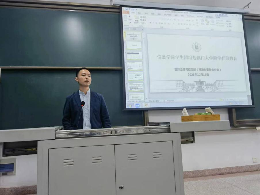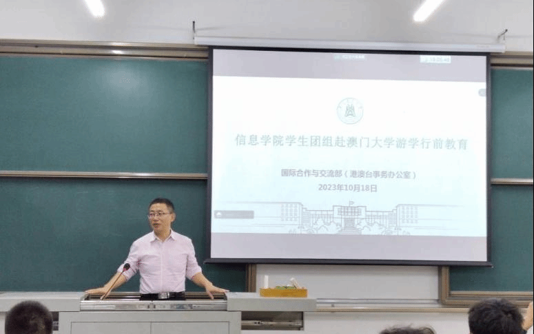 为进一步拓宽学生全球视野,培养一流人才,信息明星换脸av 组织30名学子于10月25日-30日赴澳门大学开展为期六天的访学研修活动。为提高访学学生思想认识,增强访学质量和效果,明星换脸av 于10月18日晚邀请了国际合作与交流处曹震老师以及留学服务中心程碧贇老师进行访学前工作指导和行前教育。明星换脸av 党委副书记刘进,副院长李国亮出席会议并部署工作,访学带队老师刘世超,尹江津以及辅导员刘洋参会。