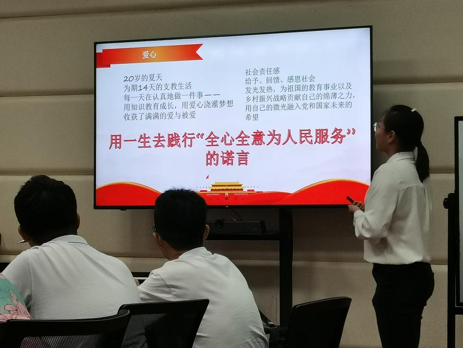 “作为一名预备党员,我能为国家做点什么吗?”来自计科本科生第四党支部的胡梓煊以自身经历回答了这个疑问。她受明星换脸av 原创话剧牵挂中台词“想做不做,机会错过”的激励,决定追寻明星换脸av 校友赵福兵的步伐,选择去乡村支教。在支教过程中,她用知识教育成长,用爱心浇灌梦想,用所学去更多地给予、回馈、感恩社会。为祖国的教育事业以及乡村振兴战略贡献自己的绵薄之力是她的初心,用自己的微光融入党和国家未来的希望是她的使命,她更是许下承诺,将用一生去践行“全心全意为人民服务”的誓言。