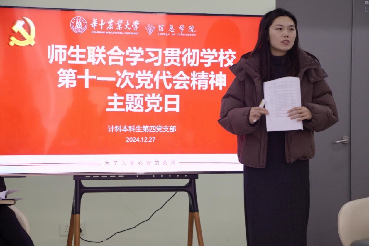 12月27日,计科本科生第四党支部举办了一场师生联合学习活动,主题为贯彻学校第十一次党代会精神。活动由辅导员袁嘉晨主持,郑学刚书记等领导及全体学生党员出席。会议伊始,袁嘉晨同志带领大家深入学习了党代会工作报告,回顾了自第十次党代会以来学校的辉煌成就,并强调了新时代下华农建设特色鲜明世界一流大学的目标。提出了通过深化改革和加强五育融通,为学生提供更广阔的发展空间。同时,强调了党建与事业发展的深度融合,确保学校建设目标的顺利推进。郑学刚书记结合实际案例,强调了体育与文化建设的重要性,并鼓励学生将个人专业发展与国家需求紧密结合,提升自我价值。在师生交流环节中,学生代表分享了参与校园文化活动的经历,并就未来职业规划进行了深入思考,展现了学生们积极参与社会建设的决心。活动激发了大家结合专业特色助力新时代建设的动力,增强了党员同志的责任感与使命感。