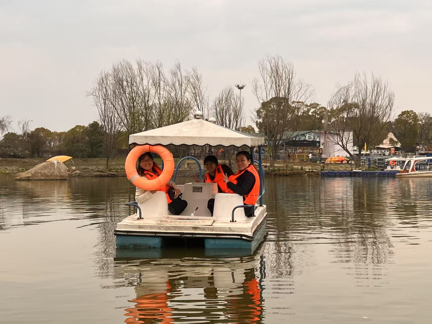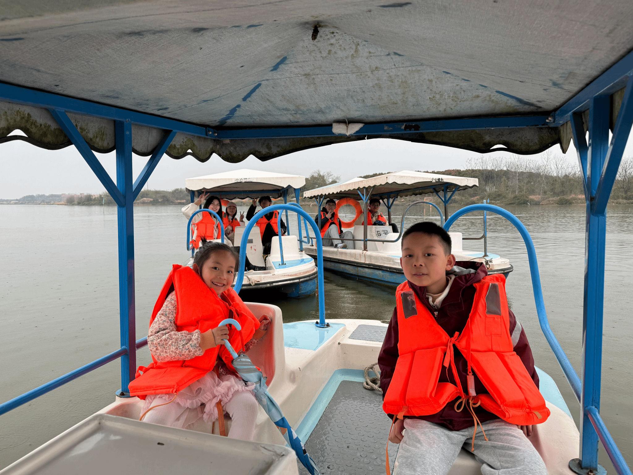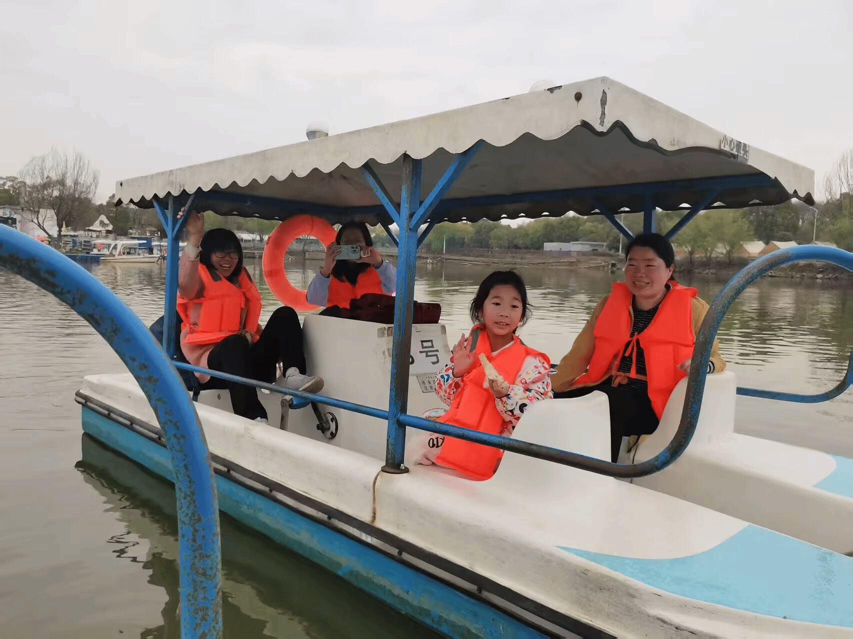 游船环节,正赶上漫天绵绵春雨,李燕、姚雅鹃、潘志斌、陈金等老师陪着家人孩子或同事,四人一组,脚踏轻舟,荡漾在梁子湖水面上的波光粼粼和袅袅仙气中。