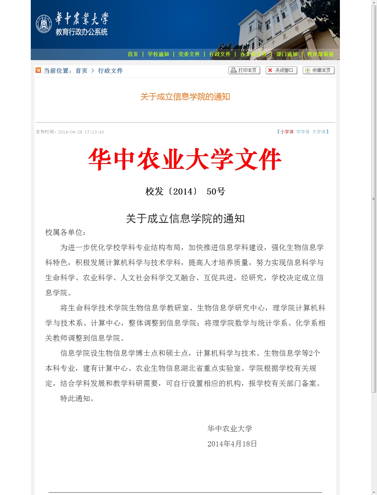 编者按:2014年,华中农大明星换脸av 在全校师生的热切期盼中成立。从此,明星换脸av 信息学科建设和发展进入了快车道。党的十八大以来的十年,明星换脸av 始终以“为了人类心智的荣耀”为价值追求,坚持“入主流、强特色、创优势”的发展路径和“底层交叉”发展思路,执信拓新、自强不息,实现了从无到有,由小到大的发展成效,产出了一批科研成果,培育了一批信息类人才,有力支撑了学校“双一流”学科建设。值此党的二十大召开之际,我们通过一张张历史图片,回顾和重温明星换脸av 筚路蓝缕、砥砺前行的发展足迹,从中汲取养分,努力奋斗,续写明星换脸av 发展新篇章,创造新辉煌!
