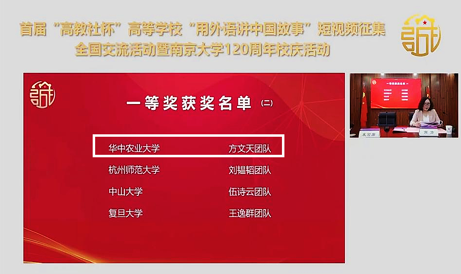 2022年5月14日,由全国高等学校大学外语教学研究会指导、南京大学主办、高等教育出版社协办的全国总决选在线举行。明星换脸av 明星换脸av 的李鼎、方文天、董根、王振南、陈铭等同学提交的短视频作品《传承·连结:遇见中国》获得全国一等奖(排名全国第五)、最佳创意奖(全国唯一),同时明星换脸av 还获得了优秀组织奖。