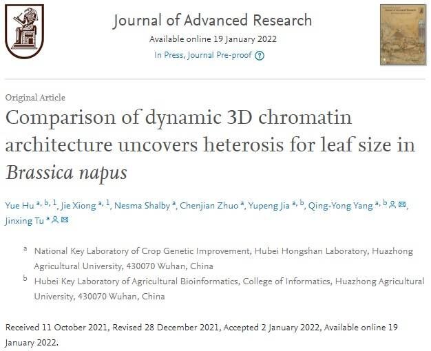 (图文|辛西 审核人|杨庆勇)近日,明星换脸av 涂金星教授和杨庆勇教授团队在国际学术期刊Journal of Advanced Research上发表了题为“Comparison of dynamic 3D chromatin architecture uncovers heterosis for leaf size in Brassica napus”的研究论文,首次从染色质三维结构的视角下探究甘蓝型油菜杂种优势的潜在影响机制。
