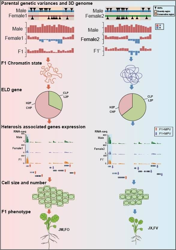杂种优势(Heterosis)是生物界普遍存在的遗传现象,指杂合体在一种或多种性状(如生活力、生长势、繁殖力、抗逆性、产量、品质等)上优于双亲的现象。杂种优势育种在农业生产中的成功应用为提高农作物产量、解决粮食危机、保障粮食安全等方面做出了巨大贡献。为进一步提高杂种优势的利用潜力,充分发挥其更好的引领杂交种选育和指导人类生产的重要作用,进一步深入研究其机理,尤其是分子遗传基础方面,具有重要科学意义。然而现有研究较多关注一维层面的DNA序列引起的遗传变异对子代杂种优势的影响,忽略了染色质在三维空间中对杂种优势的影响,杂种优势现象背后的机制仍不完全清楚。
