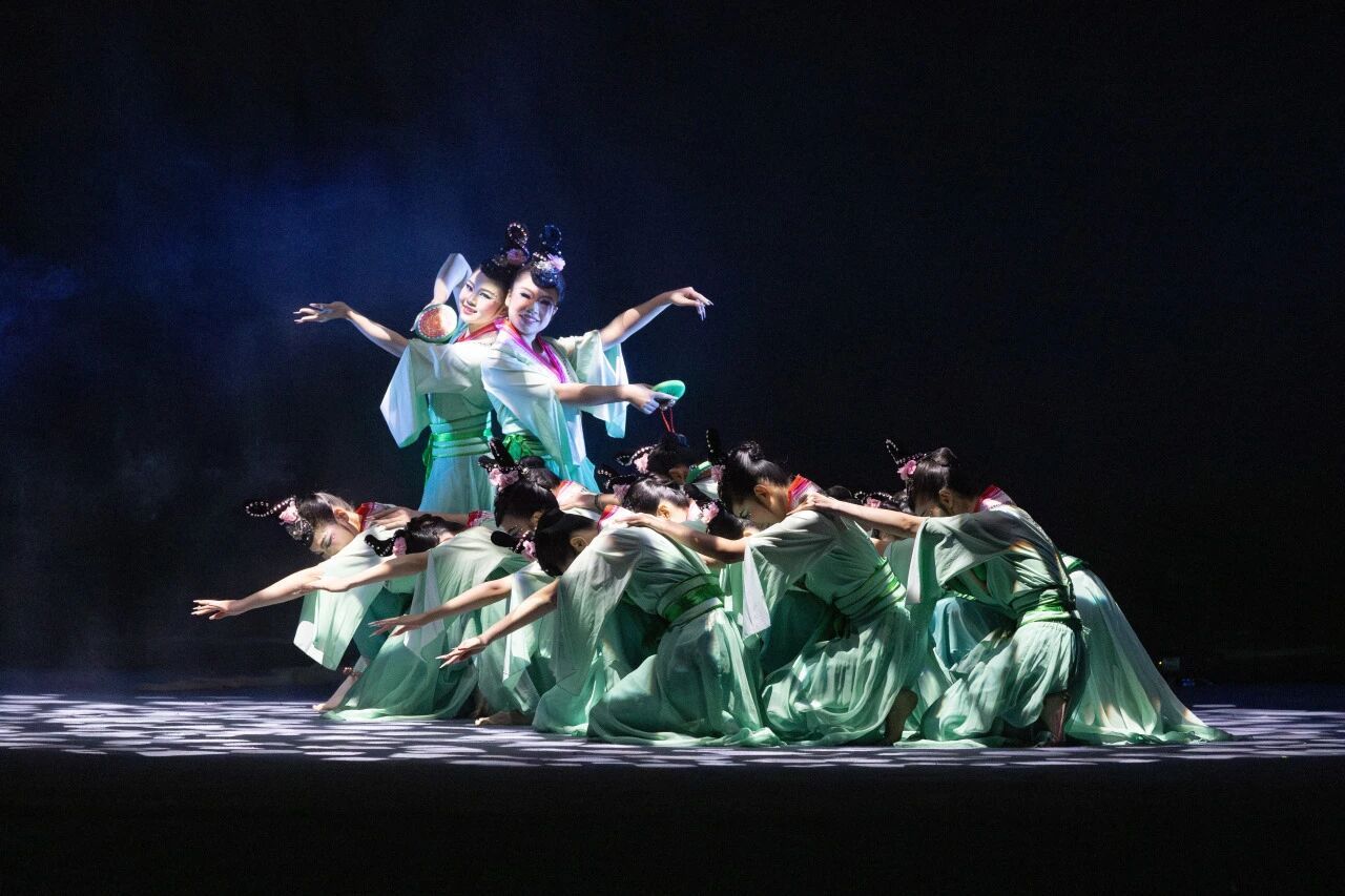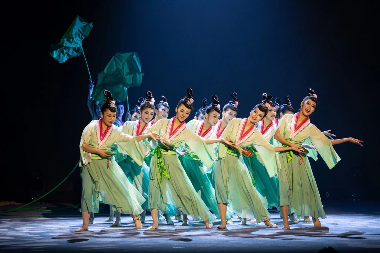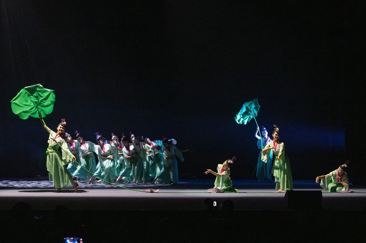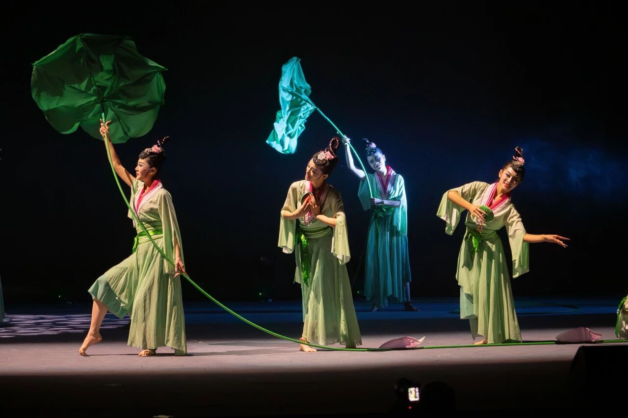 舞蹈《莲鼓越歌行》以莲为魂、以鼓为韵,巧妙融合了传统民间舞蹈的灵动与古典舞的雅致。轻盈旋转的裙摆似水中绽放的莲瓣,传递出“出淤泥而不染”的君子风骨,清脆激昂的莲鼓鼓点与“放河灯”等动作结合,将观众带入“泛水采芙蓉,归来衣更香”的唯美江南画卷中,唤醒着人们对祈福文化的记忆。舞者们时而翩跹如莲,时而随鼓点顿挫起舞,将传统美学中“刚柔并济”的特质展现得淋漓尽致,将一幅流动的传统画卷在舞台上徐徐展开。