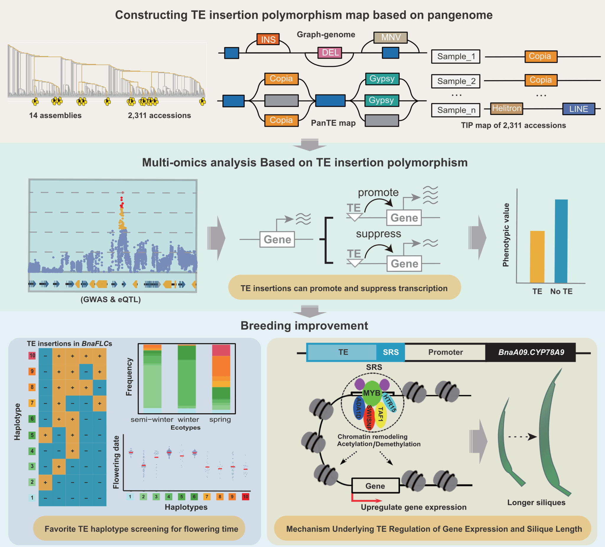 泛转座子图谱的构建及其调控开花期和产量等重要性状的新机制示意图