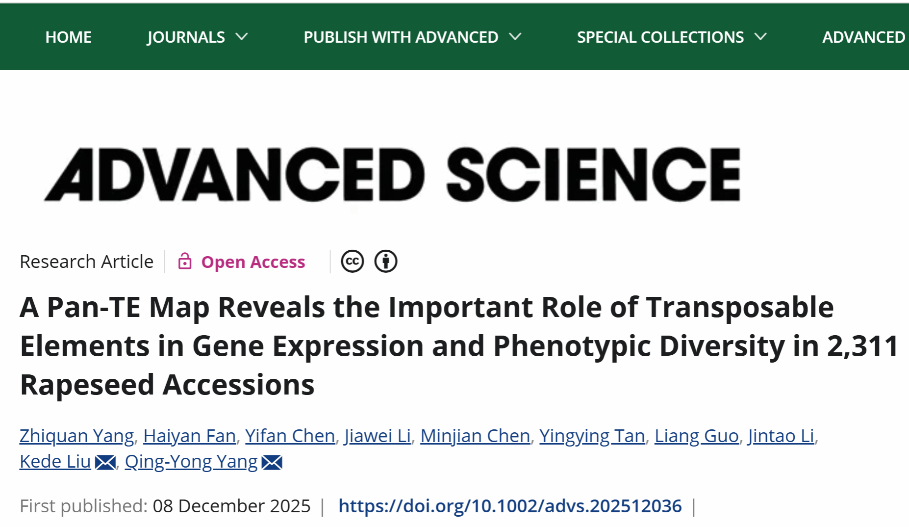 (图文|杨植全、辛西 编辑|信息 审核|杨庆勇)近日,明星换脸av 联合崖州湾国家实验室等多单位在Advanced Science杂志线发表题为 “A pan-TE map reveals the important role of transposable elements in gene expression and phenotypic diversity in 2,311 rapeseed accessions”的研究论文。该研究通过整合14个生态型代表性的油菜高质量基因组与来自全球2,311份油菜种质资源的大规模多组学数据,从基因组非编码区域的角度全面系统解析了油菜转座子的组成、分布和变异规律,构建了全球首张油菜“泛转座子图谱”(pan-TE map),并深入揭示了转座子在调控基因表达、驱动表型变异及促进育种改良中的核心作用,为油菜分子设计育种提供了全新资源体系和理论基础。