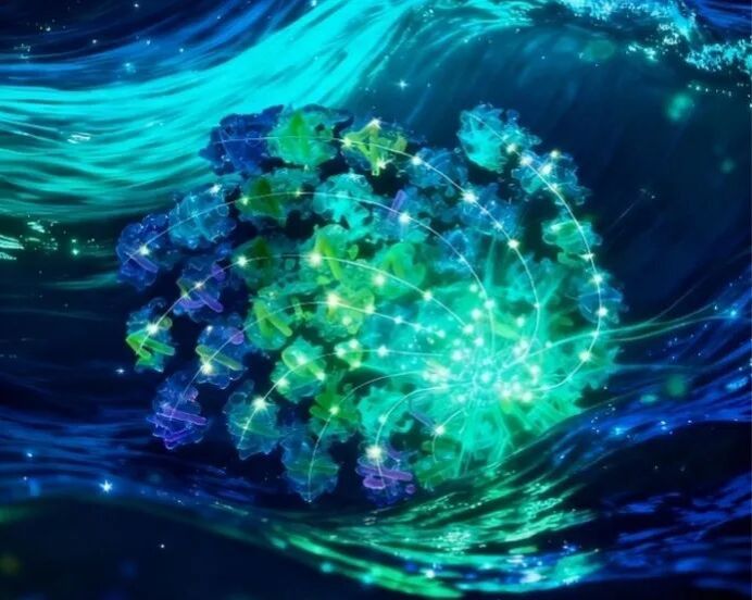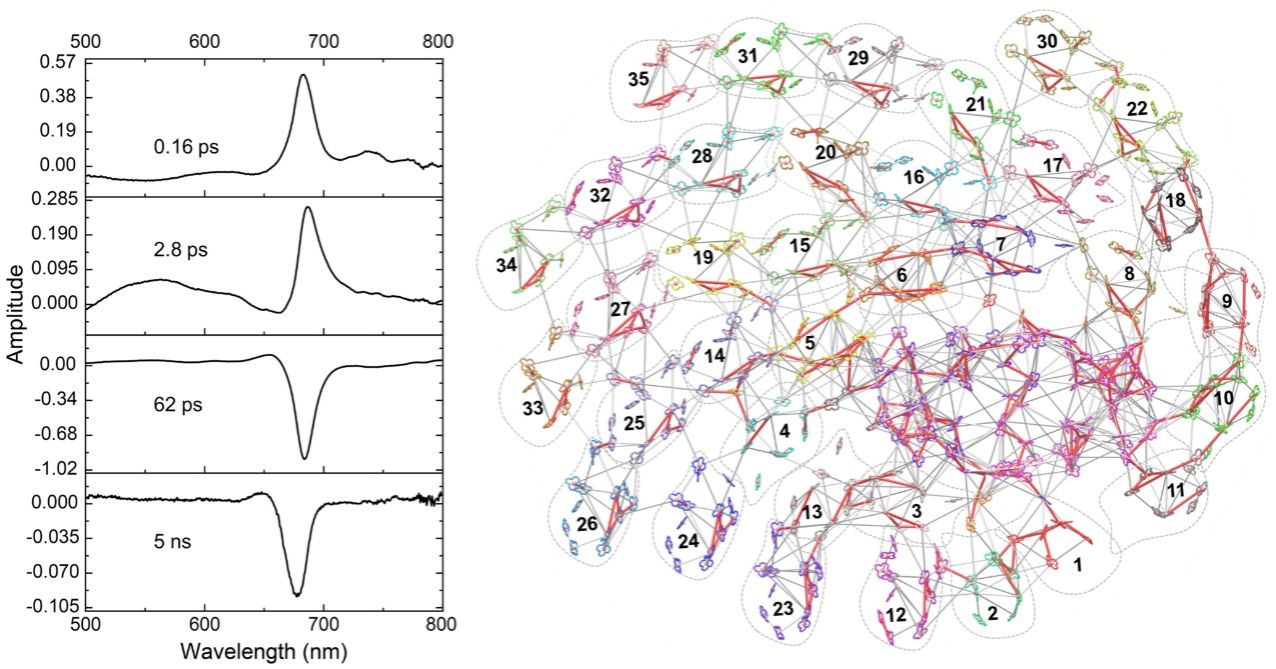 颗石藻捕光天线系统色素含量异常丰富,包含700多个色素分子。其中,叶绿素c和类胡萝卜素的比例显著高于其他藻类,帮助其高效吸收海洋中穿透力强的蓝绿光,适应海洋真光层下部的弱光环境,是其广泛分布并常形成大规模水华的重要基础。拥有如此庞大的天线和素色网络,能量能否有效传递是核心问题。研究显示能量主要沿着天线蛋白“纤维”路径,通过精致排列的叶绿素分子高效汇聚至核心,仅需约62皮秒。捕光复合物的独特排布及大量色素保证了庞大系统内能量传输的高效性。该成果揭示了颗石藻超大PSI–LHCI复合体的精密构造与高效工作机理,阐明了其适应深海弱光环境的独特策略,推进了光合作用基础研究,为未来设计新型高效人工光合系统或改良作物光能利用提供了珍贵的结构蓝图和进化启示。