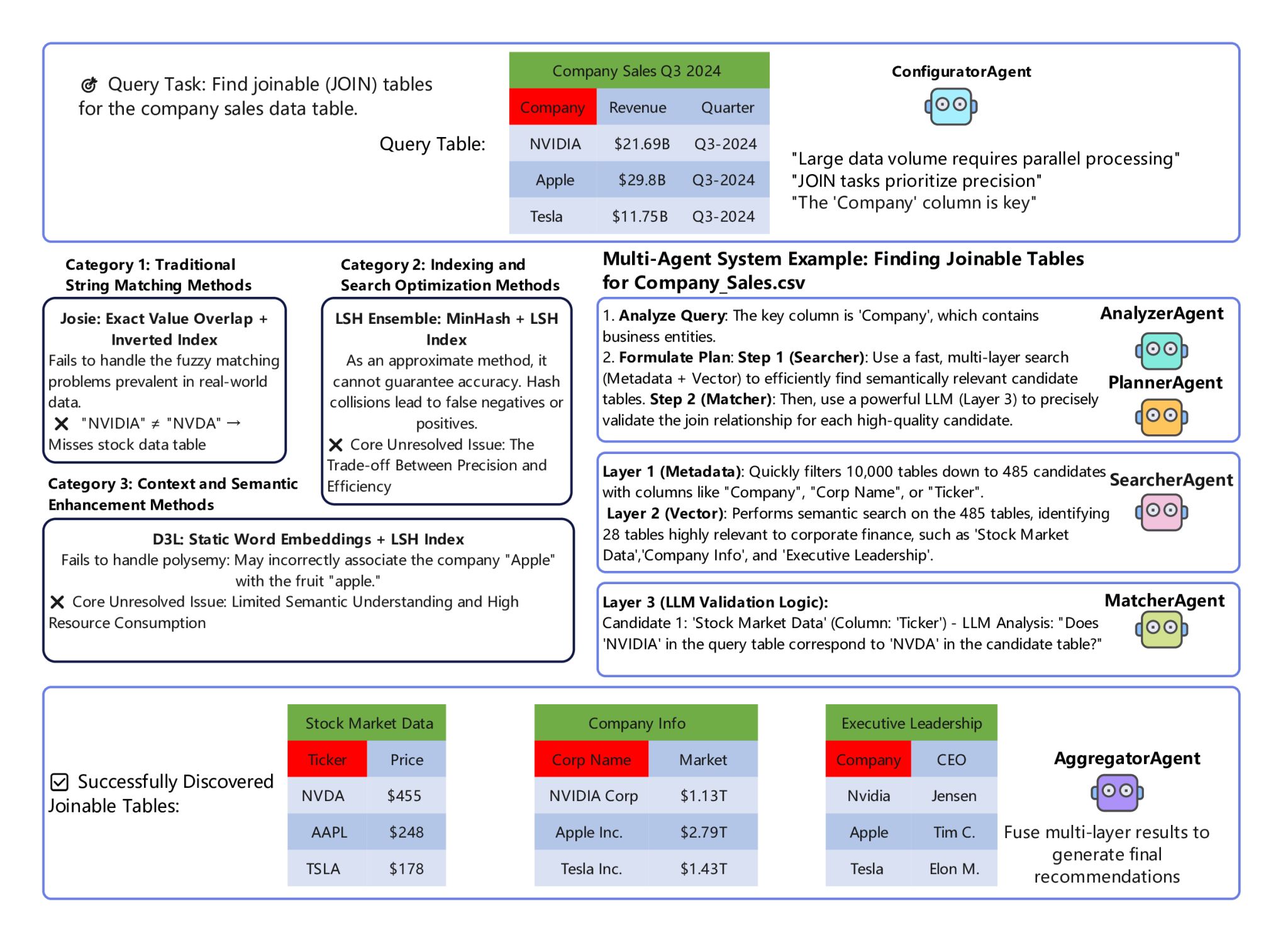 在Web大数据时代,从数十亿个HTML表格和开放数据集中发现可连接(Joinable)或可并集(Unionable)的表格,是数据分析和知识发现的关键步骤。然而现有单一策略方法往往顾此失彼,传统字符串匹配方法处理速度快但无法识别语义变体(如无法将“NVIDIA”与“NVDA”关联);而基于深度学习的方法虽准确但计算成本过高,难以应对海量数据。