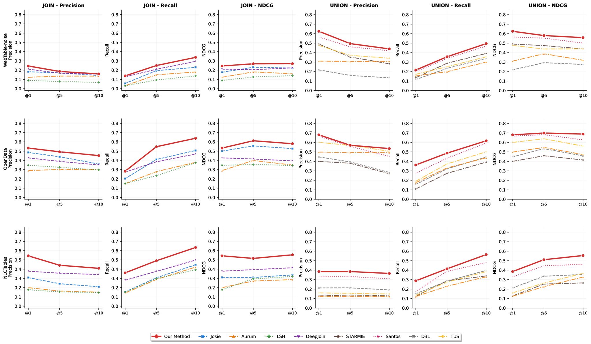 研究团队在包含噪声的真实Web数据(WebTable-noise)、政府开放数据(OpenData)以及自然语言查询的表格数据集(NLCTables)3个多样化数据集上进行广泛实验。结果显示(图3),该框架在Join和Union两类任务所有关键指标(Precision, Recall, NDCG)上均显著优于DeepJoin、Santos、Starmie等现有最先进方法。特别是在处理含有大量拼写错误和格式差异的噪声数据时,该框架凭借LLM的深度推理能力,展现出卓越鲁棒性。此外,成本分析表明,通过使用Gemini 1.5 Flash等轻量级模型,该系统在保持高精度同时,可将计算成本控制在极低水平,具备极高应用推广价值。