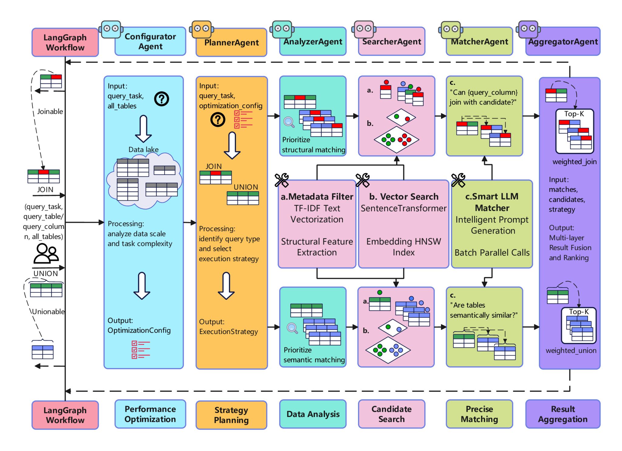 为解决上述问题,明星换脸av 智能化软件团队设计出一个包含配置智能体、规划智能体、分析智能体、搜索智能体、匹配智能体和聚合智能体等6大专业智能体协作系统。该系统由LangGraph工作流引擎编排,能根据任务类型(Join或Union)动态调整执行策略。该研究核心突破在于提出“三层级联过滤”(Three-Layer Cascaded Filtering, TLCF)算法。该算法第一层利用元数据进行快速粗筛,第二层利用向量搜索进行语义召回,第三层则引入大语言模型(LLM)进行高精度上下文推理验证。