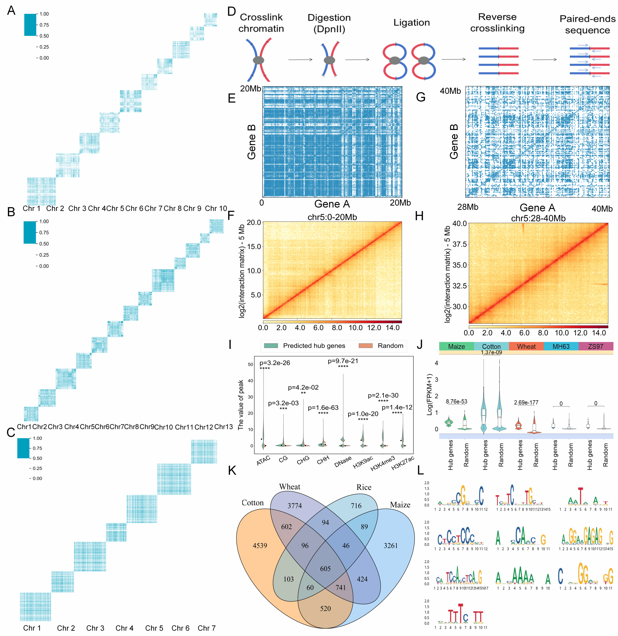 利用构建PlantCTCIP模型对四个物种(玉米、棉花、小麦和水稻)全基因组内的染色质交互进行预测,进而对生物学实验的检测结果进行补充。具体来讲,研究团队将同一条染色体内的任意两个基因序列输入到PlantCTCIP模型,进而得到不同物种每一条染色体中的染色质交互全景(图2A-C)。为了进一步验证PlantCTCIP预测得到的染色质图谱的可靠性,研究人员选取玉米B73苗期幼叶进行了Hi-C测序(图2D)。以玉米五号染色体为例,PlantCTCIP预测得到两个区段(chr5:0-20 Mb 和 chr5:28-40 Mb)的染色质交互图谱(图2E, G),交互图谱显示出较为明显的TADs(Topologically associated domains, TADs)。进一步,将PlantCTCIP在上述两个目标区段中的预测结果与Hi-C实验结果进行对照。结果表明PlantCTCIP鉴定的交互热点区域与Hi-C实验结果显示出一致的交互模式(图2F, H),验证了PlantCTCIP模型预测的可靠性。为了探究预测结果中高交互基因的分子特征,将与靶基因交互基因的数目记为靶基因的度。研究人员对不同物种中交互度排名靠前的1,500个高交互基因(Hub基因)的分子特征进行分析。与不交互或低交互的基因相比(随机进行了50次重复),高交互的基因具有更高的表达量、更高的GC含量、基因长度更长、外显子数目更多,基因所在区域开放程度更高,同时富集了更多活跃的组蛋白修饰 (图2I, J, 附图S5)。进一步利用DeepLIFT和连续梯度方法在PPIs模式下挖掘得到四个物种影响染色质交互的重要基序。在maize, cotton, rice以及wheat四个物种分别检测到5746、 7266、1809和6382个影响染色质近端交互的重要基序(连续梯度的阈值设置为0.5)(图2J)。可见检测到的motif大部分为特异性motif,其中605个motif在不同物种中保守性。进一步将605个保守的基序进行聚类得到10个重要的核心基序(图2K)。基于TOMTOM平台(Bailey et al., 2015)将PPIs模式下鉴定到的motif与PlantTFDB等数据库进行比对,可见PlantCTCIP鉴定到的影响染色质交互的重要基序与先前报道的motif具有高度的一致性。