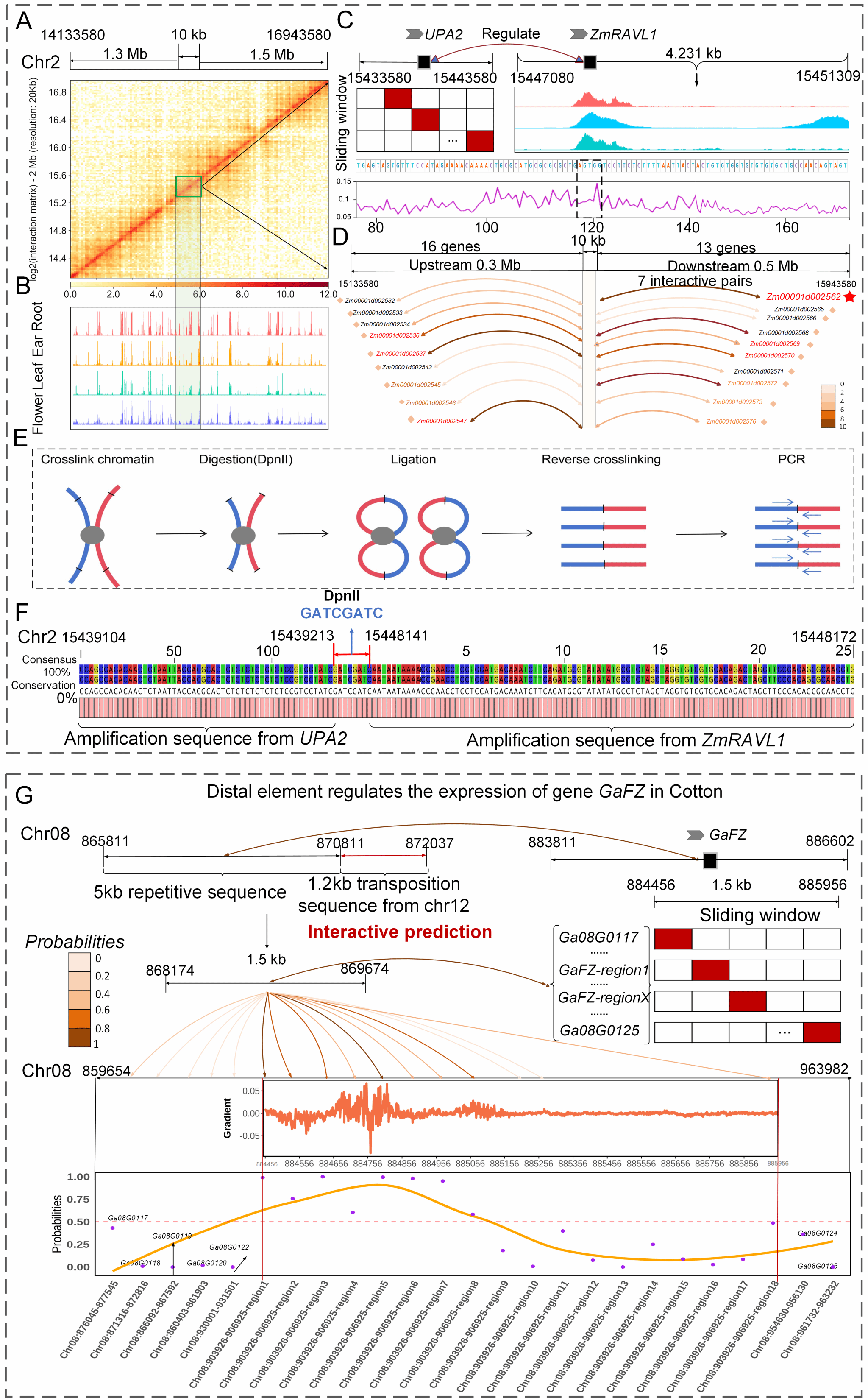 该研究将已报道的玉米基因ZmRAVL1,ZmRPG以及棉花基因GaFZ作为实例,研究人员结合3C实验揭示了PlantCTCIP可以挖掘远端调控元件中的功能位点以及辅助定位靶基因(图5)。