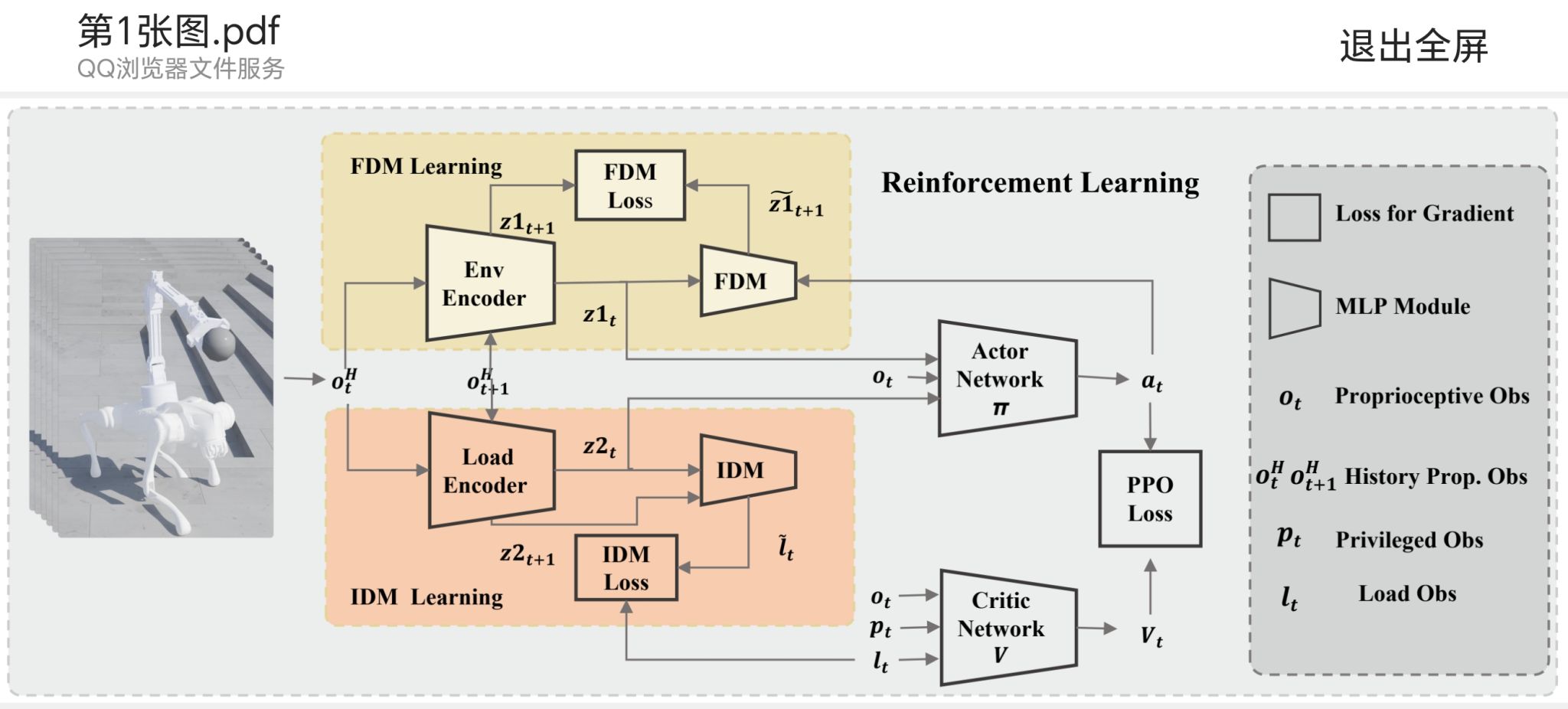 该研究首次对主动动态负载建模,利用逆动力学模型学习并捕获主动负载的动态特征(如关节位置、速度和力矩等),从而实现对未知负载扰动的隐式建模。同时,方法引入前向动力学模型以预测环境地形的变化,通过这种双动力学模型的协同作用,机器人能仅依靠本体感受信息,在运动中同步感知地形扰动并预测负载干扰,实现实时的平衡控制优化。