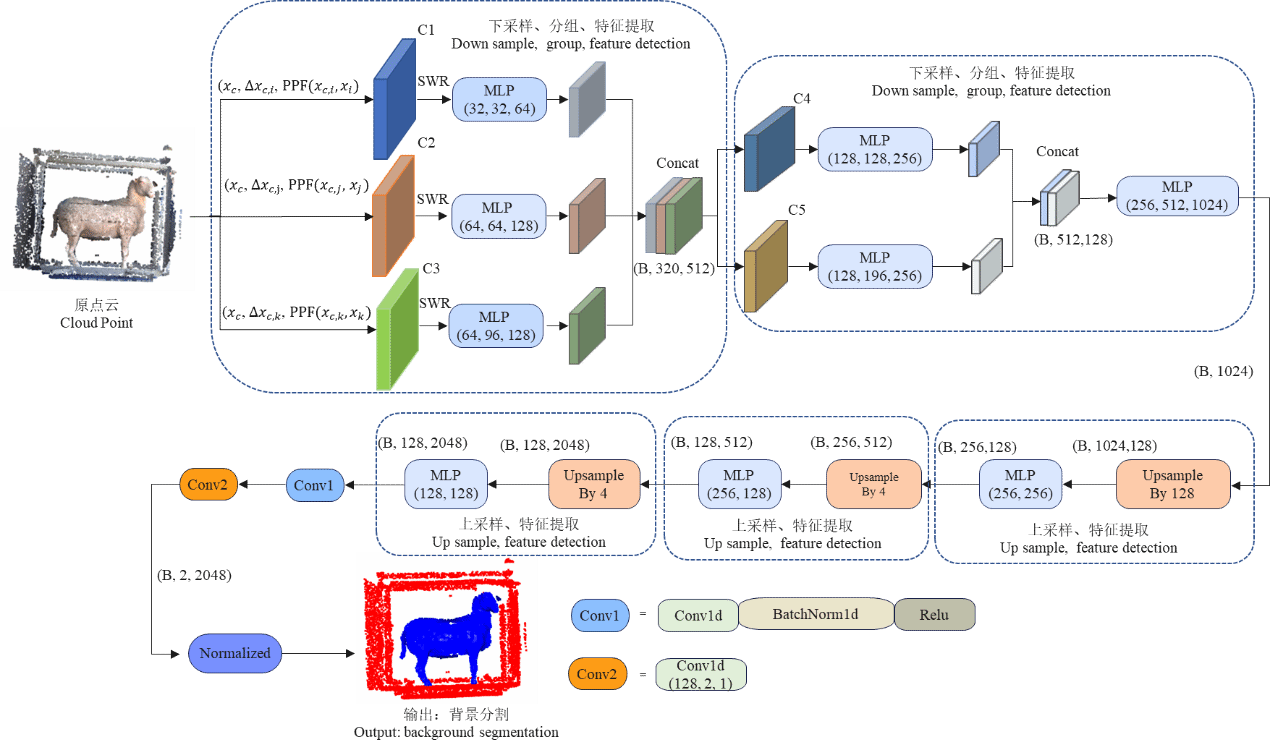 为解决上述问题,田芳副教授团队在中国甘肃省永昌县的大型商业化羊场进行了长达半年的数据采集,构建了多视角、全天候的奶绵羊点云数据集。在算法层面,团队首先提出了一种改进的PointNet++语义分割网络。针对原始网络在局部特征提取上的局限,研究引入了具有旋转不变性的点对特征(PPF),有效捕捉了点云的局部拓扑信息;同时,创新性地采用无放回随机采样(SWR)策略替代传统的FPS采样,将计算复杂度从O(N²)大幅降低至O(1),在保证空间分布质量的同时显著提升了运算效率。此外,通过引入特征变换矩阵的正则化损失,进一步增强了模型对局部细节的关注能力。