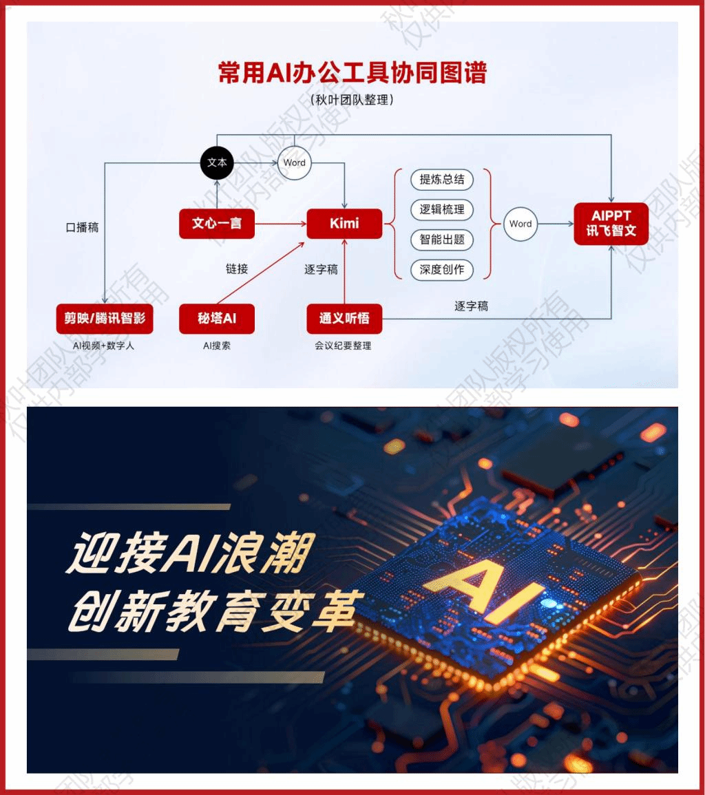 再接着,郑老师讲到AI智能设计美化PPT,要点是提炼AI口令。列举讯飞智文的智能文档创作平台,演示生成式PPT,AI一键生成PPT。最后,郑老师讲授了AI智能制作数字人教学视频,列举了度加、腾讯智影和剪映3款视频工具,指出脚本文案、凭接视频等AI生成视频操作步骤,演示了素材替换、配音调整、画质调节、统一画幅、增加细节5步提升AI视频质感。过程中,郑老师演示了用剪映克隆了画面声音;呈现了AI翻译:孪生引擎;展示了AI公文写作:新华妙笔;演绎了AI数据分析:智谱清言;整理了常用AI办公工具协同图谱。