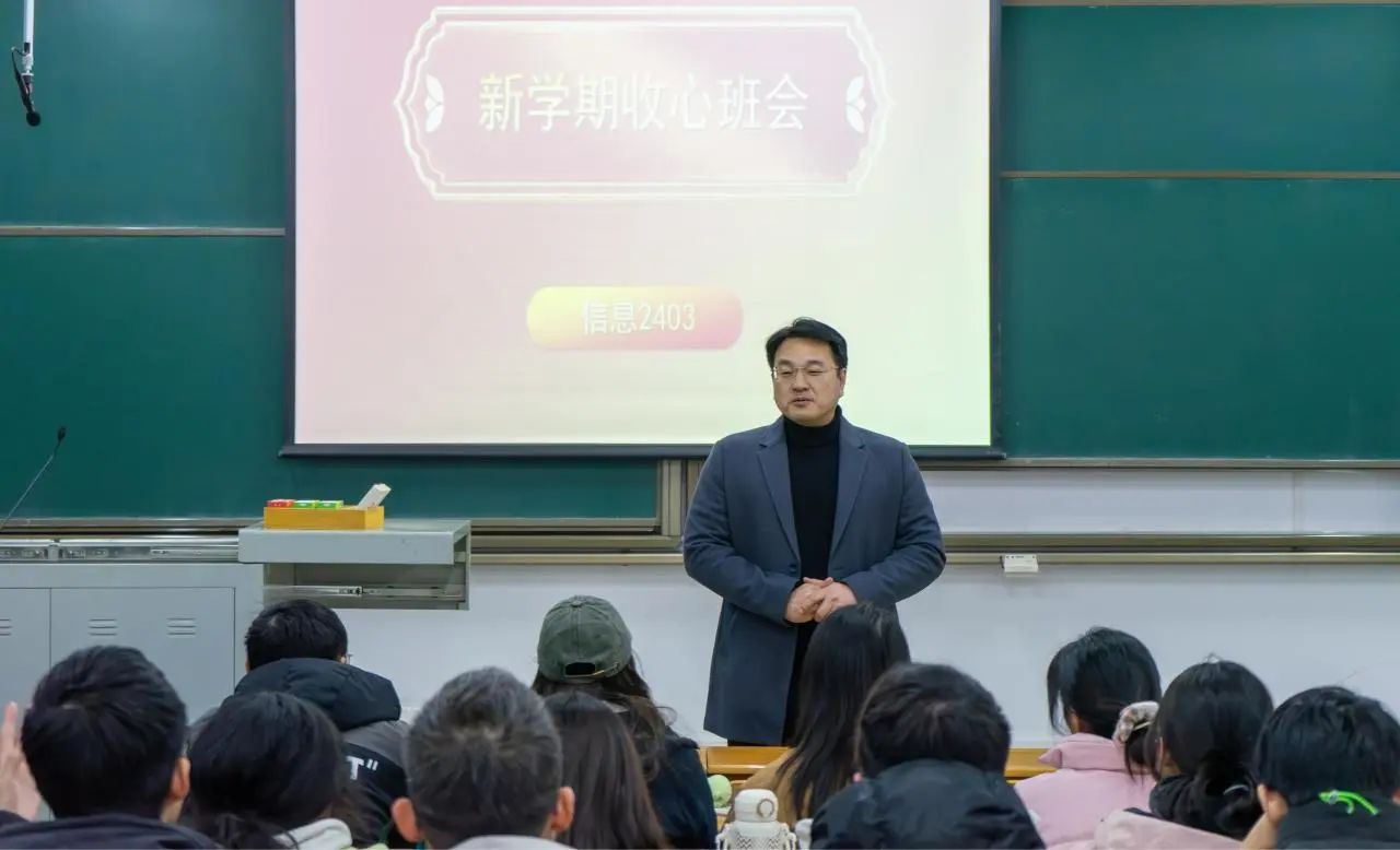 在计算机类2406班,党委副书记刘进关心同学们的到班情况,同时鼓励同学们相互交流。他提醒同学们要防诈骗,作为已经来到学校一个学期的同学,要尝试自己面对和处理问题,打好专业基础,为了将来做地基。刘进表示,除了学习还要着重注意身体锻炼,多走出宿舍,走进大自然,进一步全面发展。最后他寄语同学们:“新学期同学们要定下梦想,将梦想的种子埋到底下去,正如开学礼物‘花信有期’一般,等待梦想的茁壮成长。”